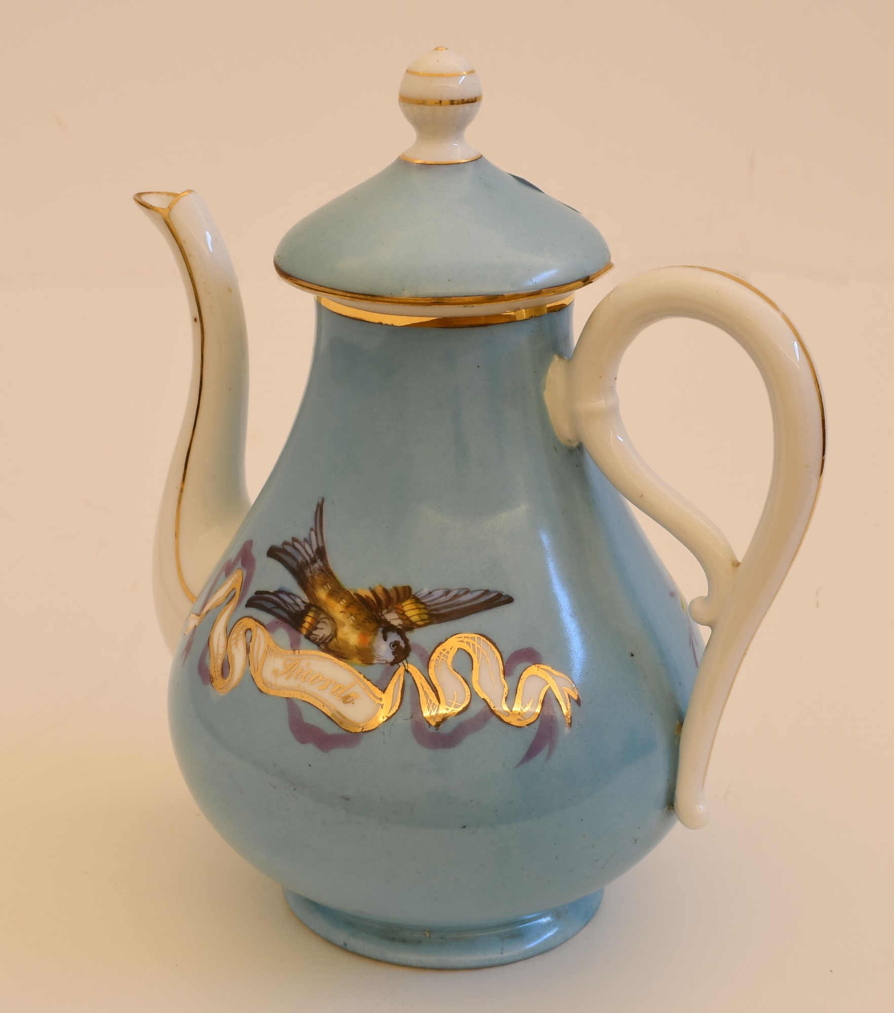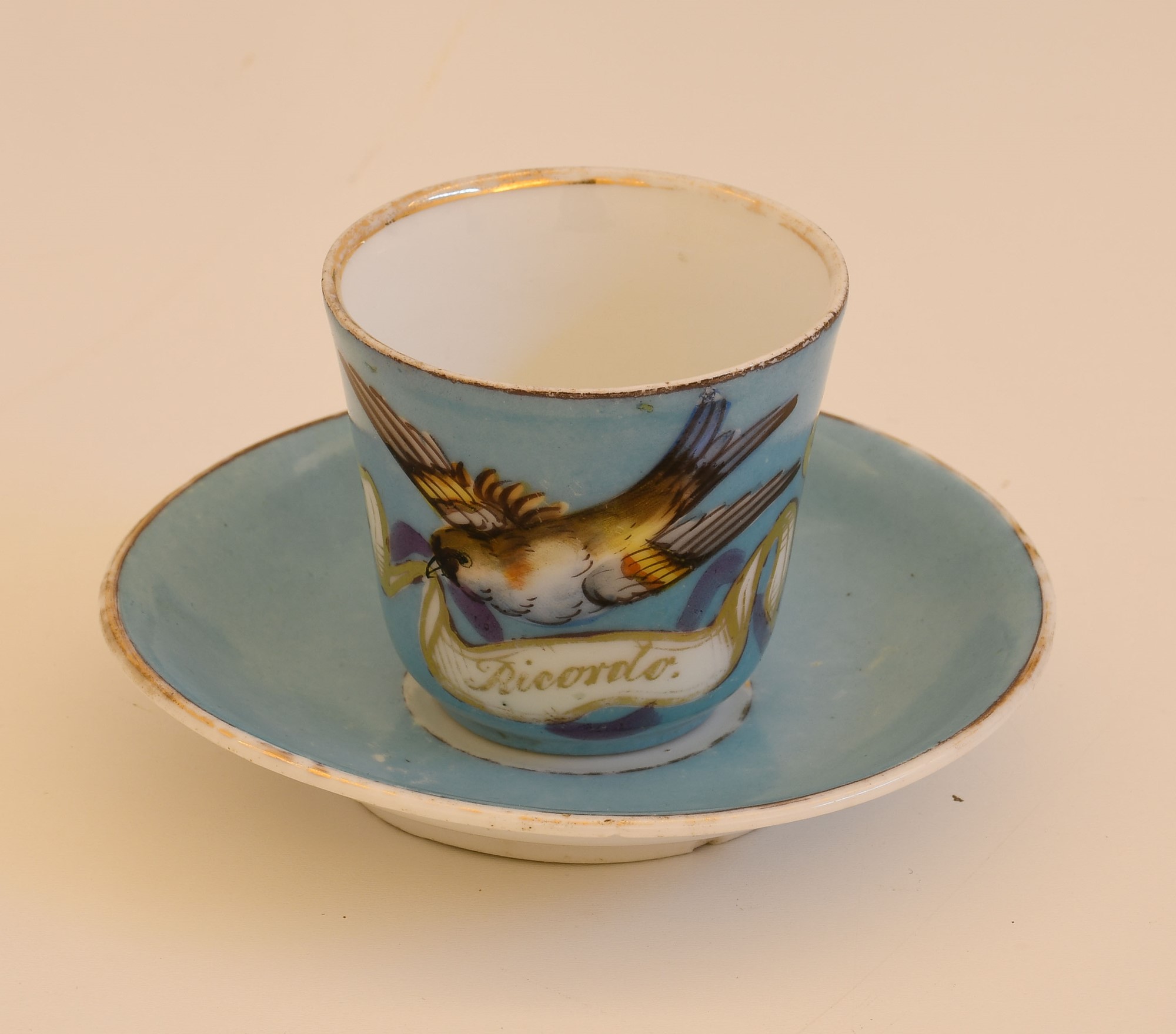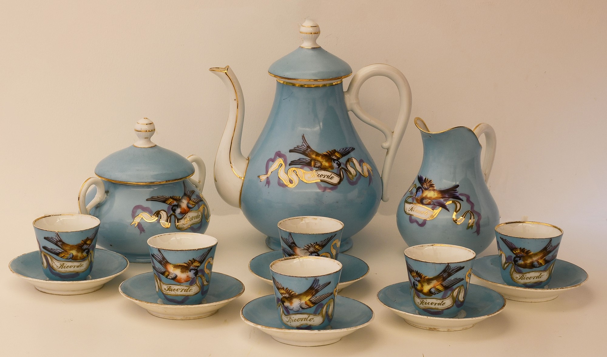 Servizio da caffè in porcellana azzurra e bianca con decoro di cardellino policromo che regge nel becco cartiglio lumeggiato in oro con la scritta Ricordo. 1870 circa