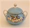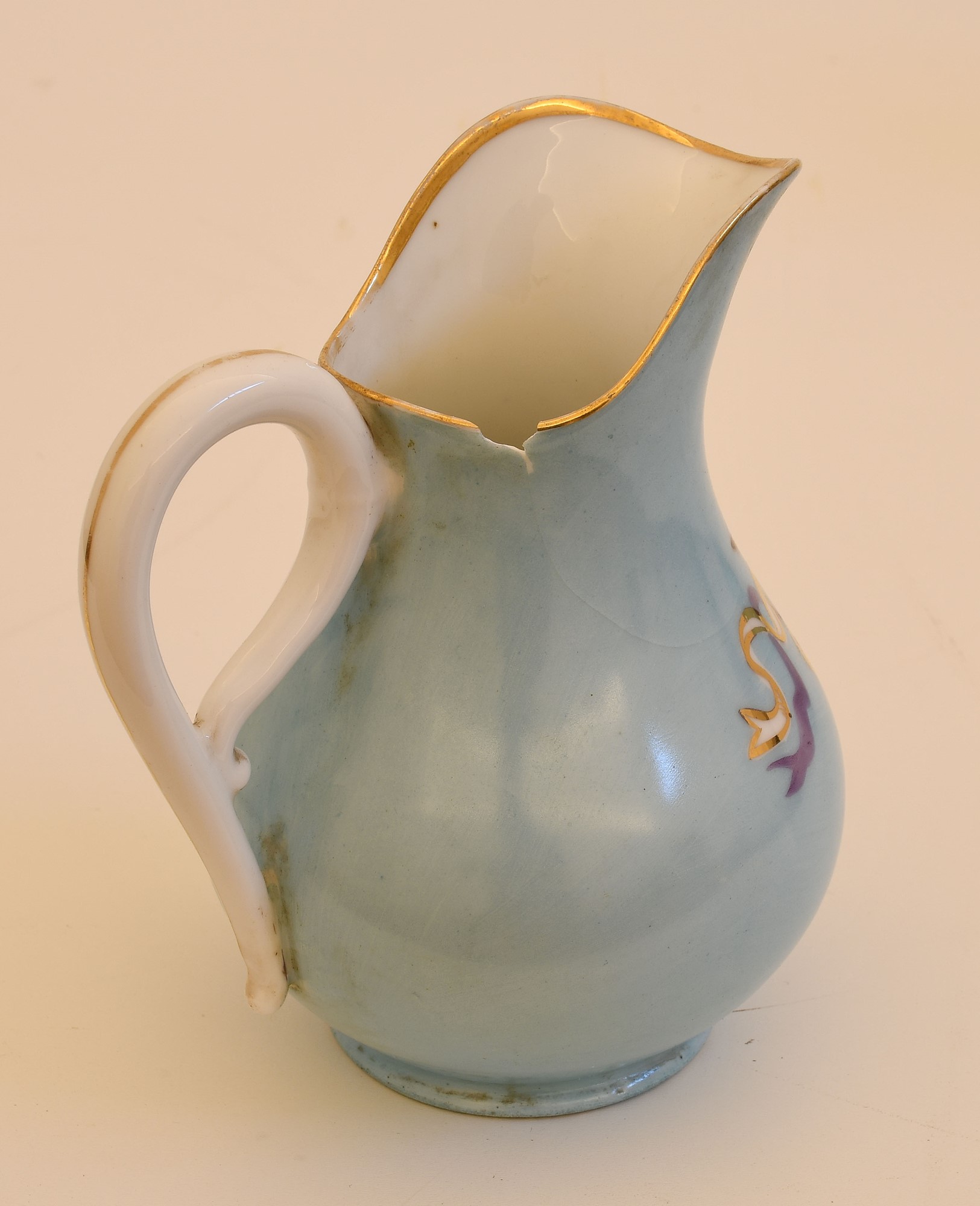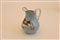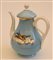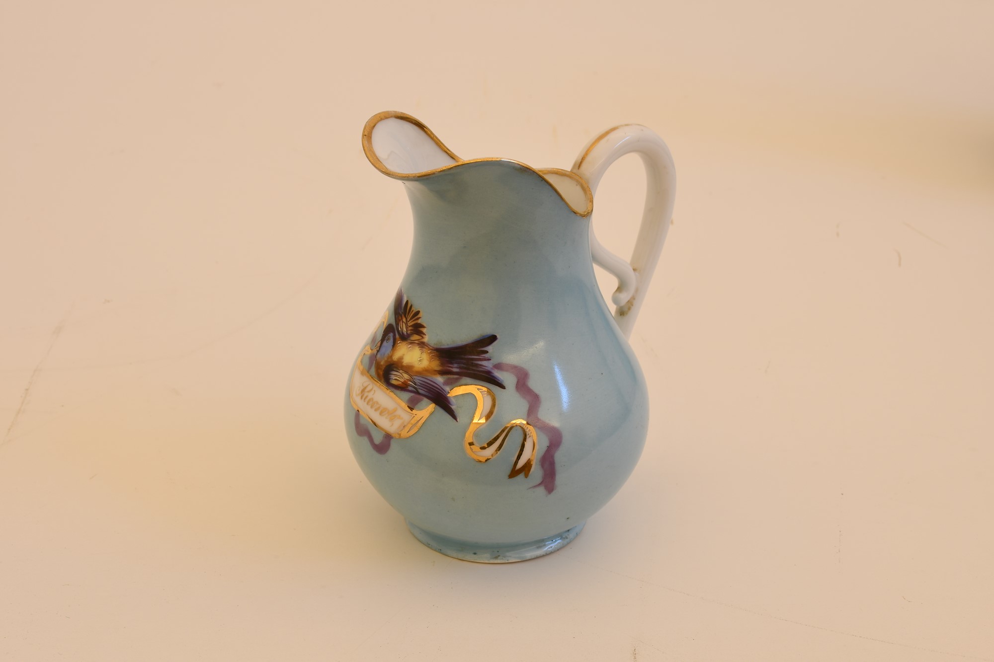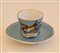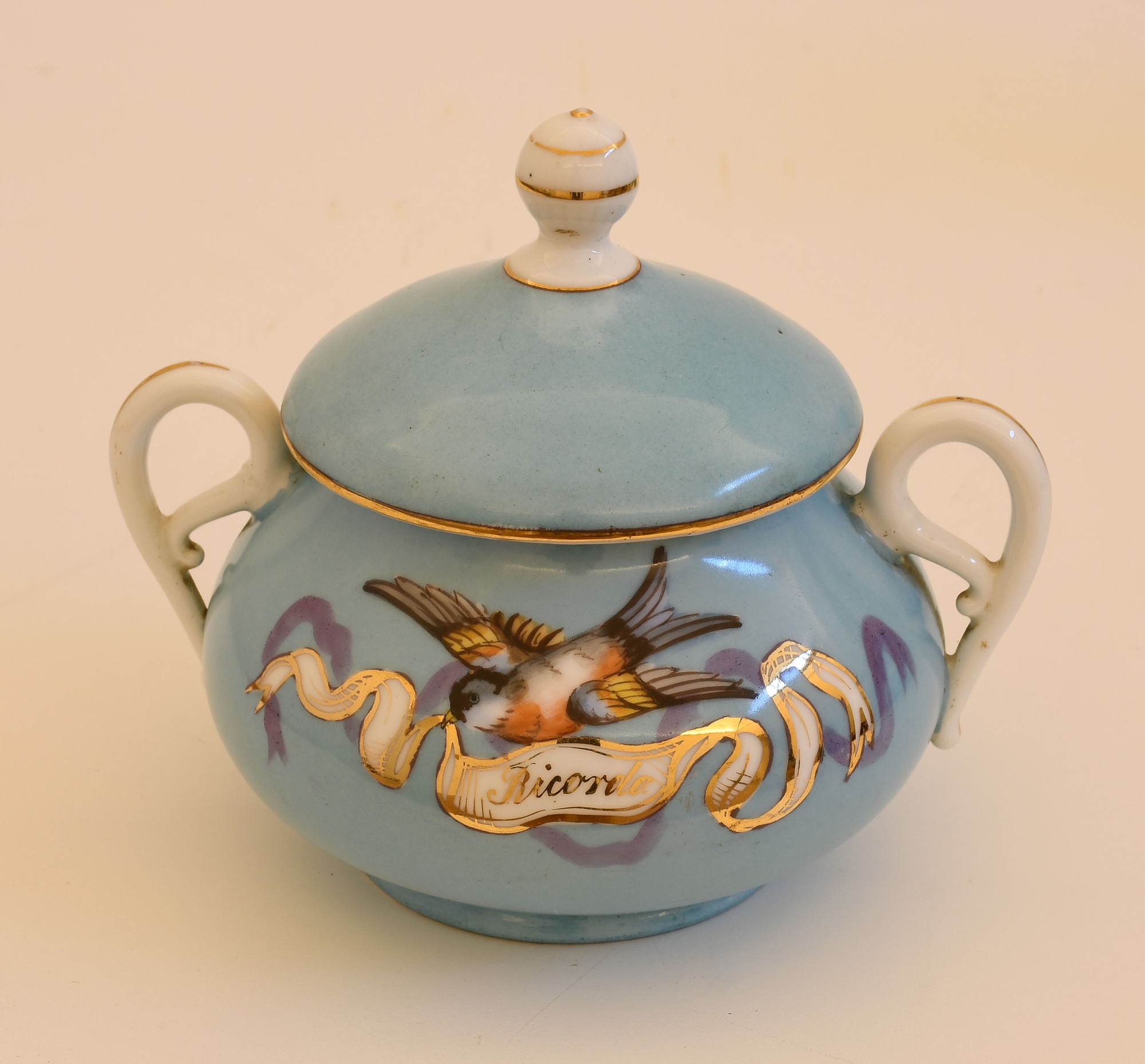 Servizio da caffè in porcellana azzurra e bianca con decoro di cardellino policromo che regge nel becco cartiglio lumeggiato in oro con la scritta Ricordo. 1870 circa
