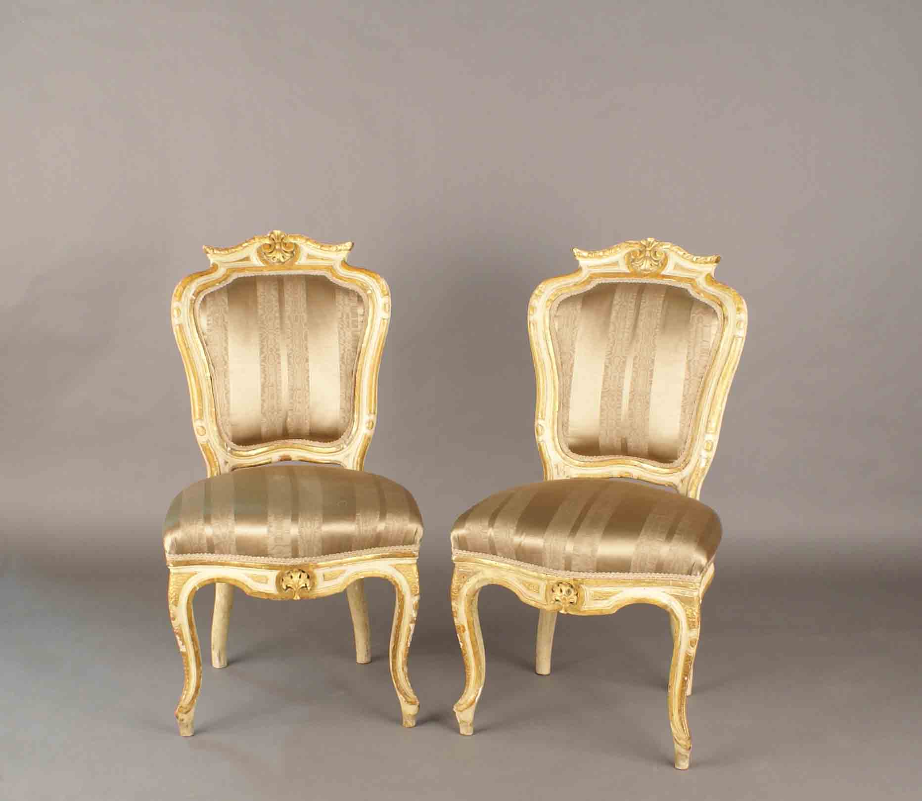 Sei sedie in legno laccato e parzialmente dorato, schienale di linea sagomata e seduta rivestita in tessuto, poggiante su gambe di linea arcuata, XIX secolo, h. cm. 91 (restauri).