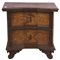 Piccolo comodino a due cassetti sul fronte in noce con intarsi in radica.