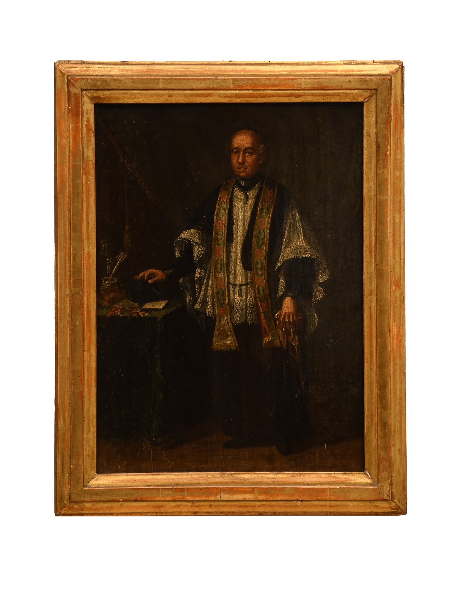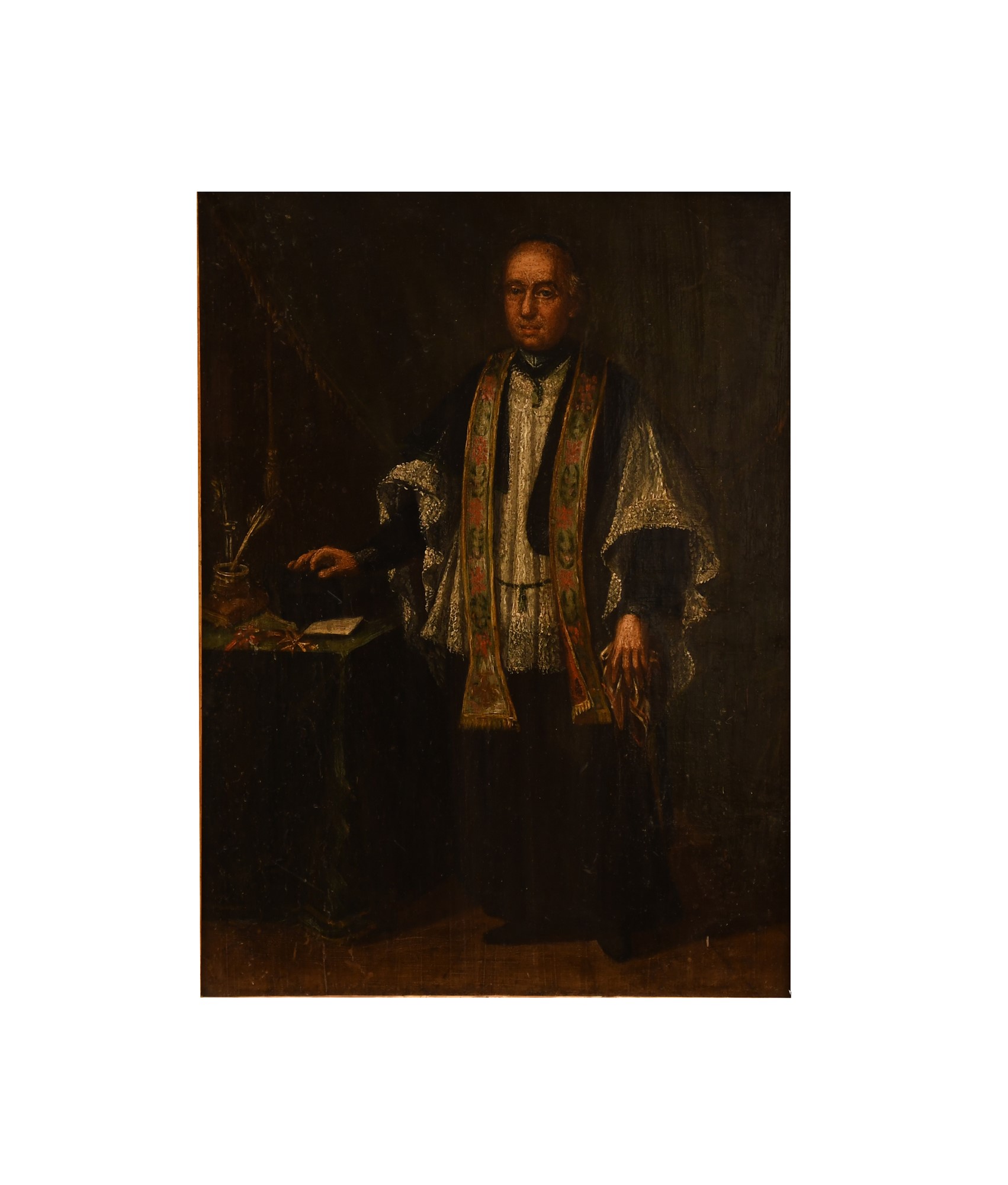 Ritratto di Vescovo con stola e paramenti accanto ad un tavolo