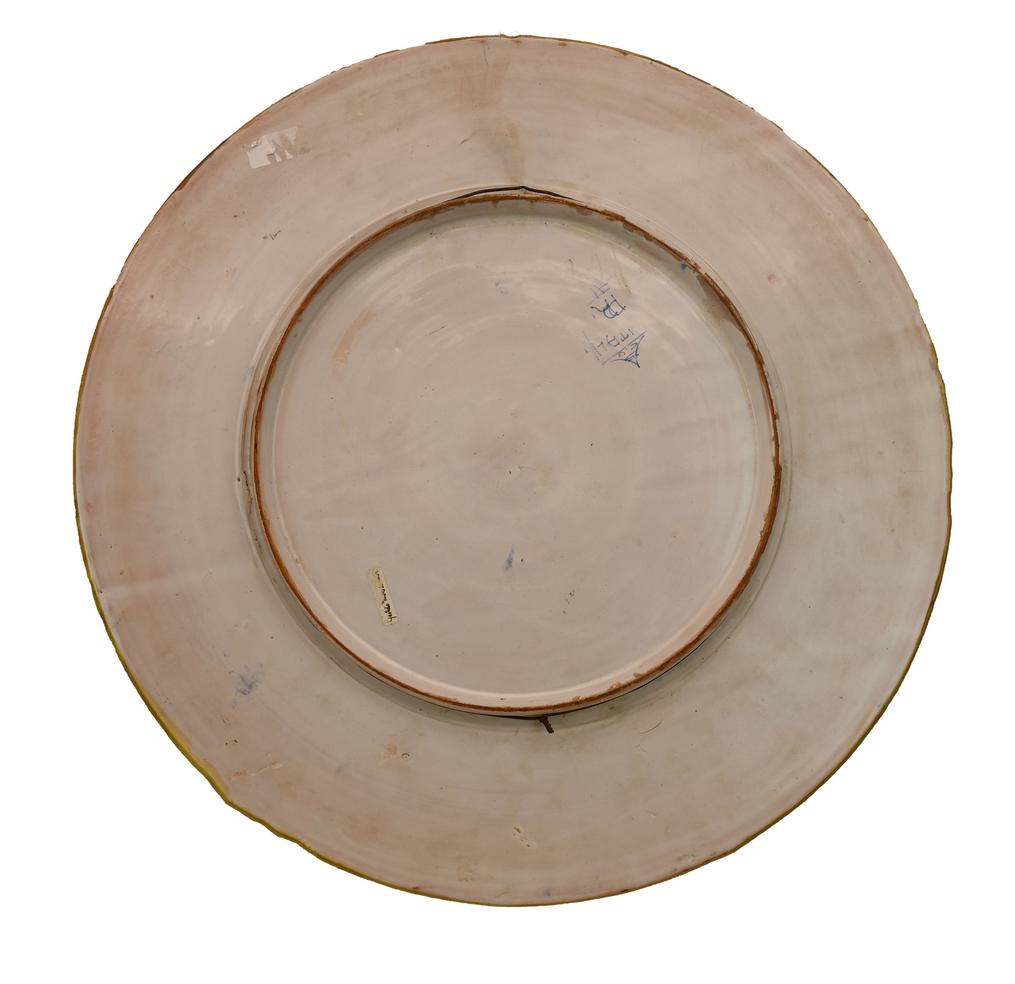 Grande piatto Gualdo Tadino dipinto a lustro. Tesa dipinta a grottesche e girali fogliati. Cavetto reca la raffigurazione di una resa militare con soldati romani. Siglato al retro SCU Italy P.R. (Paolo Rubboli)
