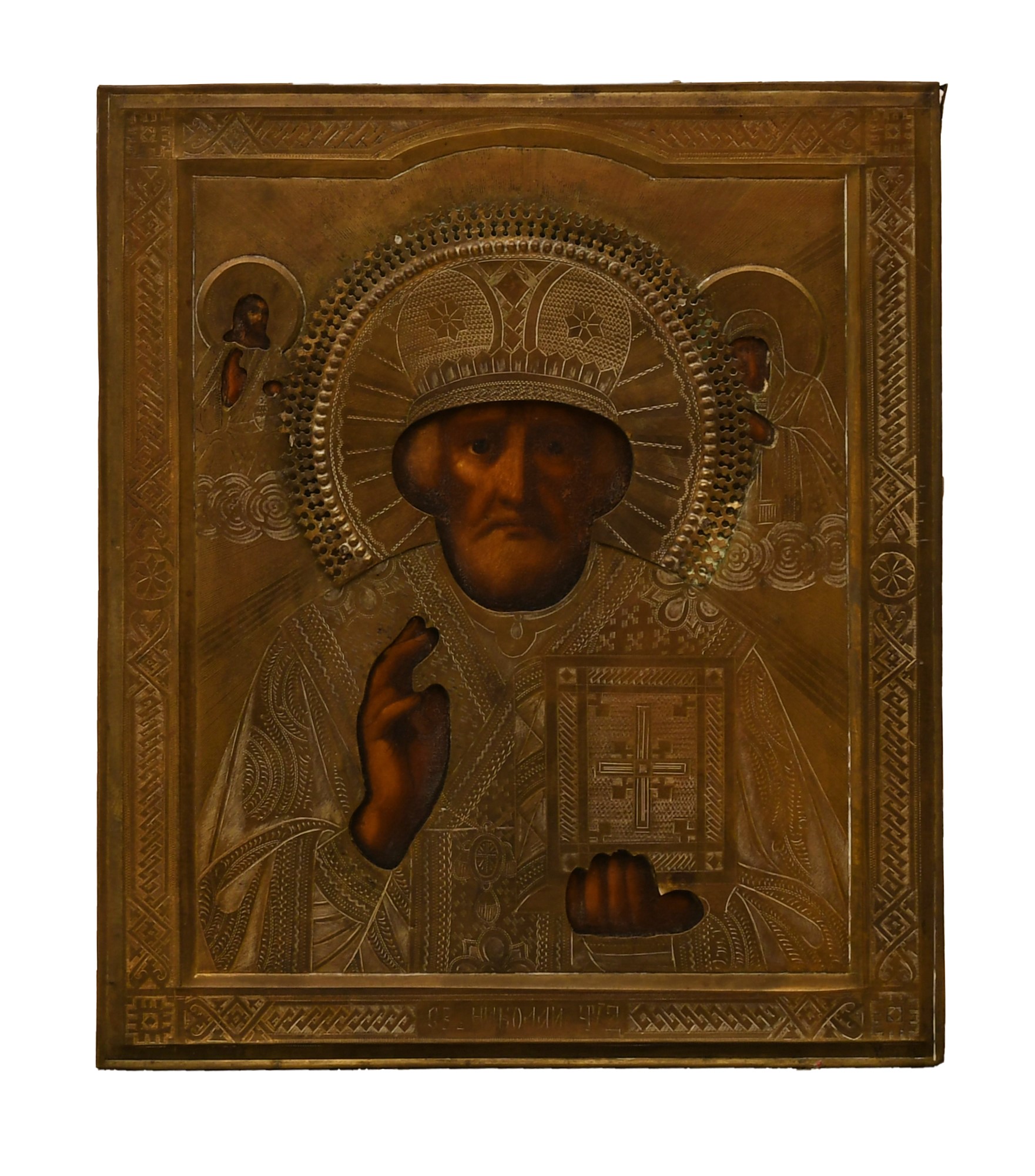 Icona russa raffigurante San Nicola con riza sbalzata e cesellata fine del XIX secolo