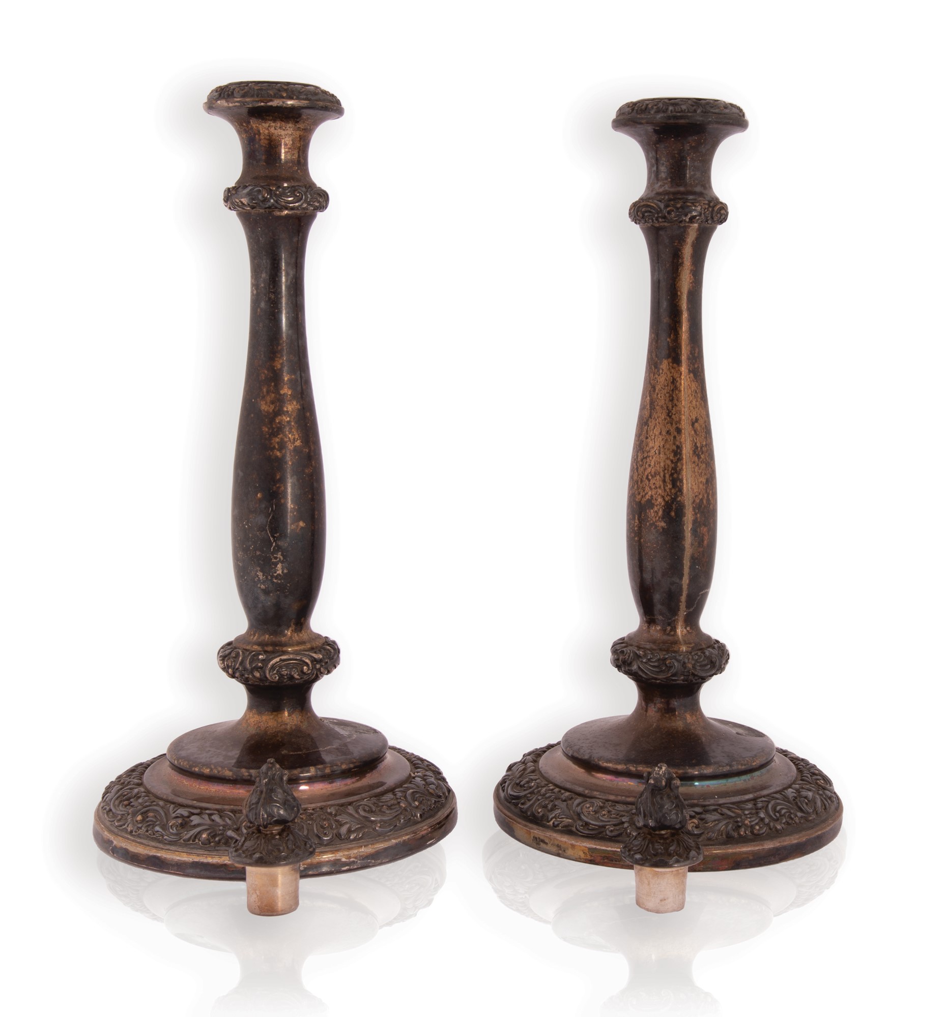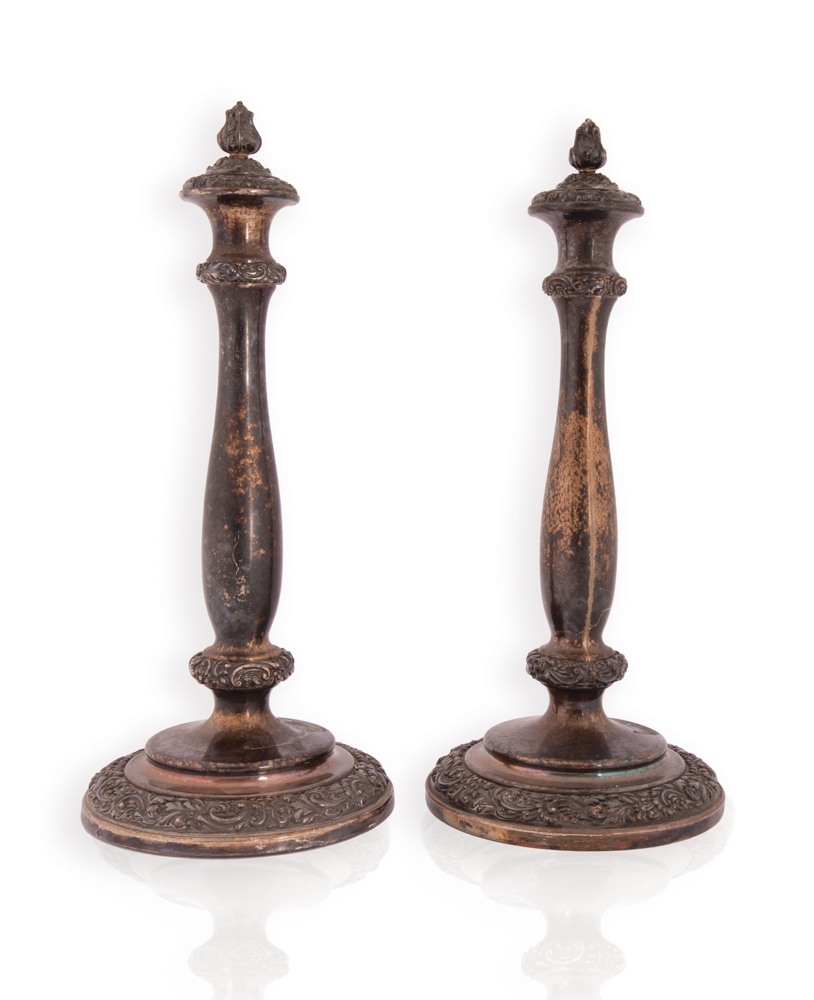 Coppia di candelieri in rame argentato con tappi altezza cm 39