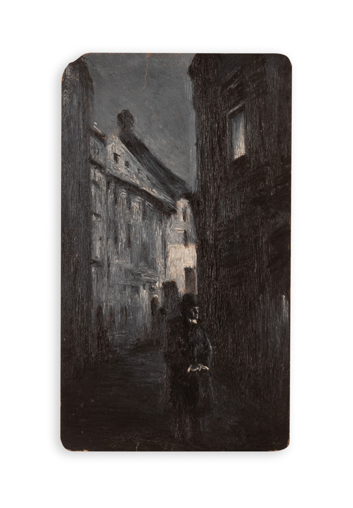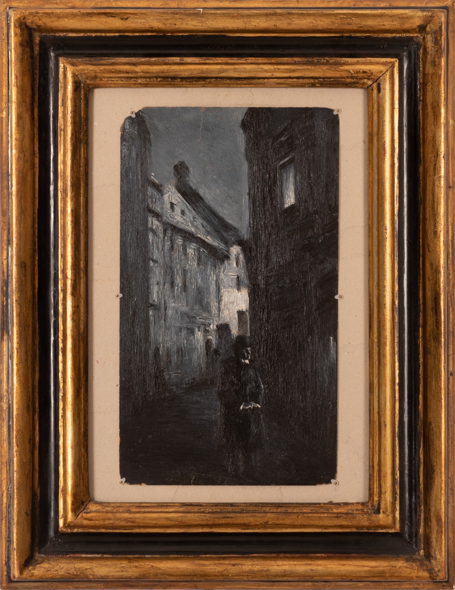 Anonimo del XX secolo ( - ) Personaggio con cappello a passeggio in un vicolo di notte Tempera su cartone montata su compensato cm 35x20; con cornice cm 54x43