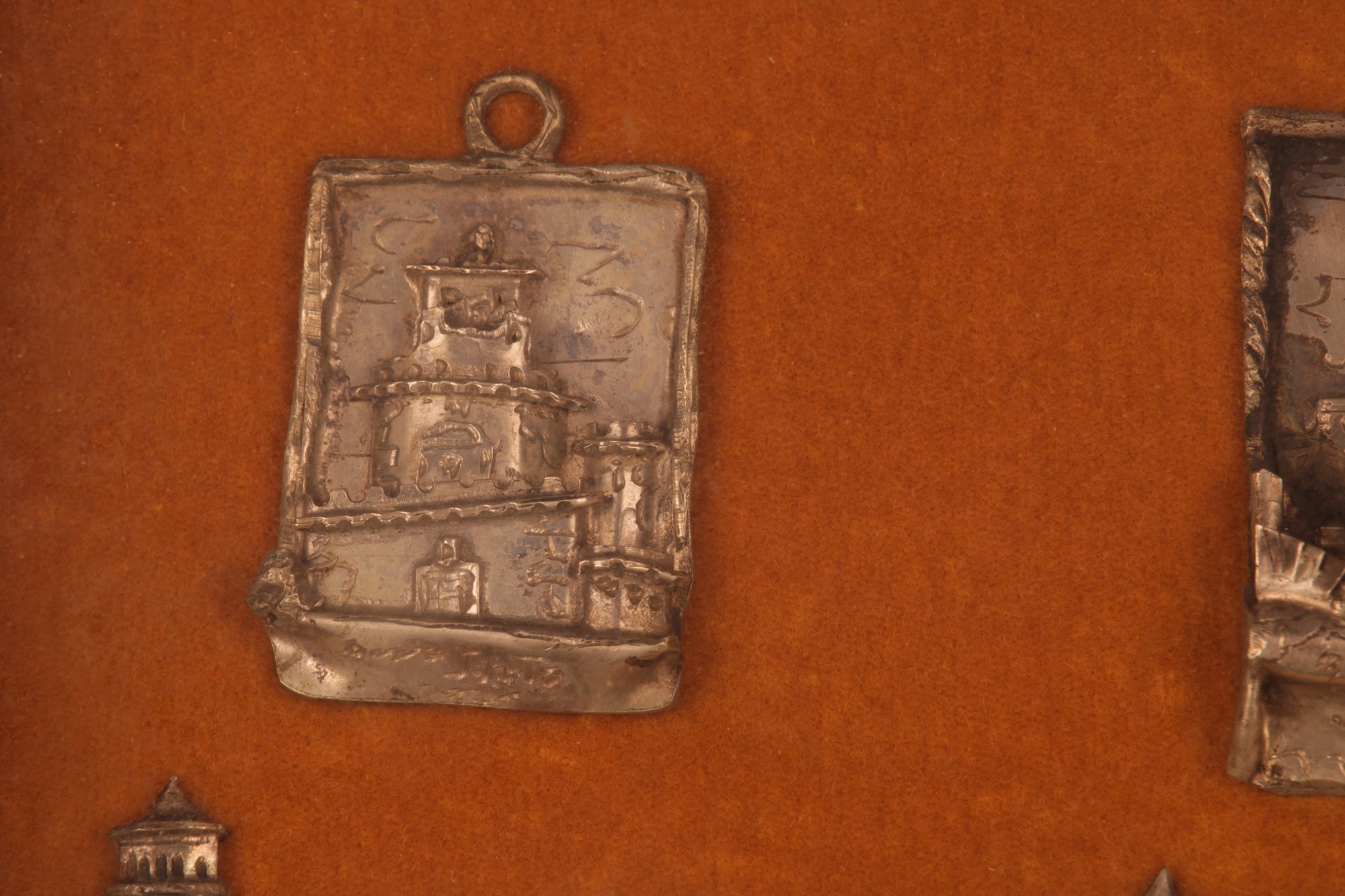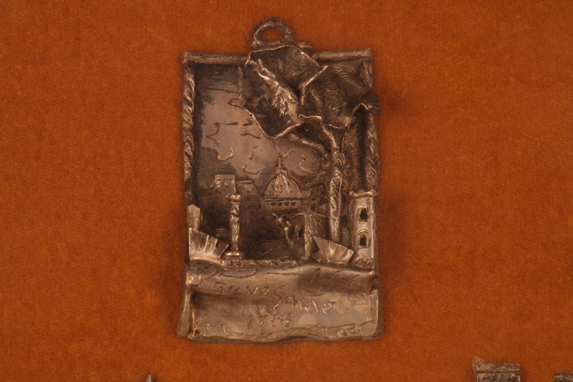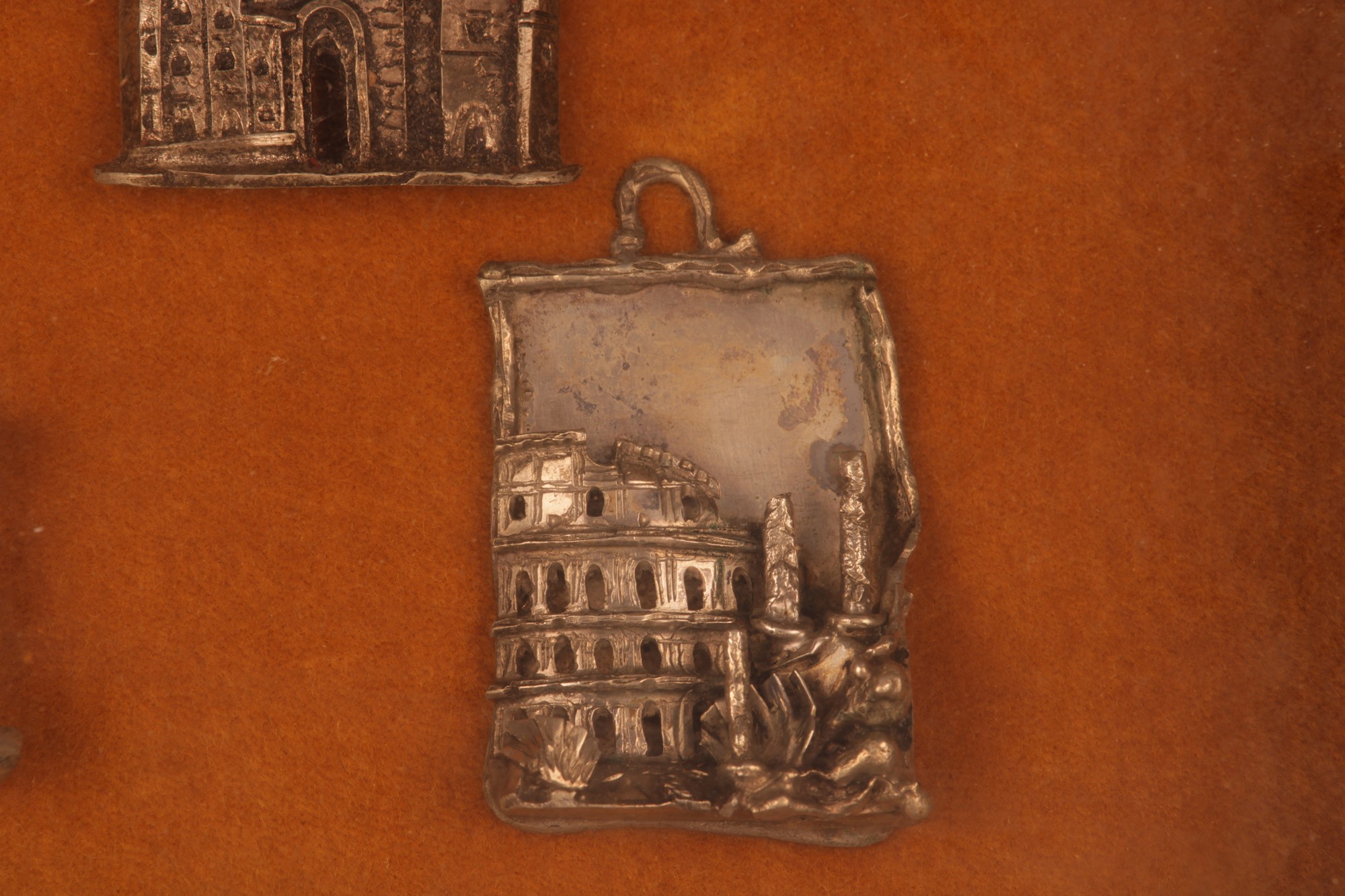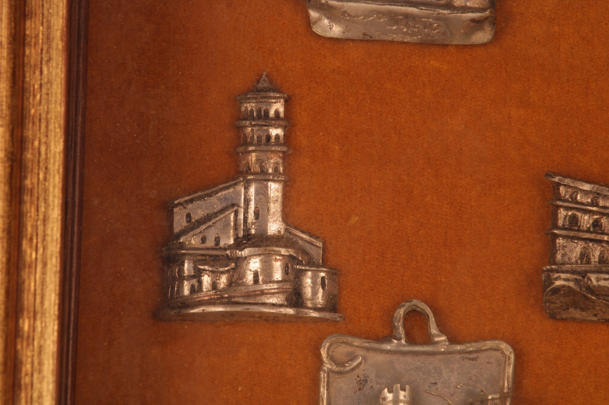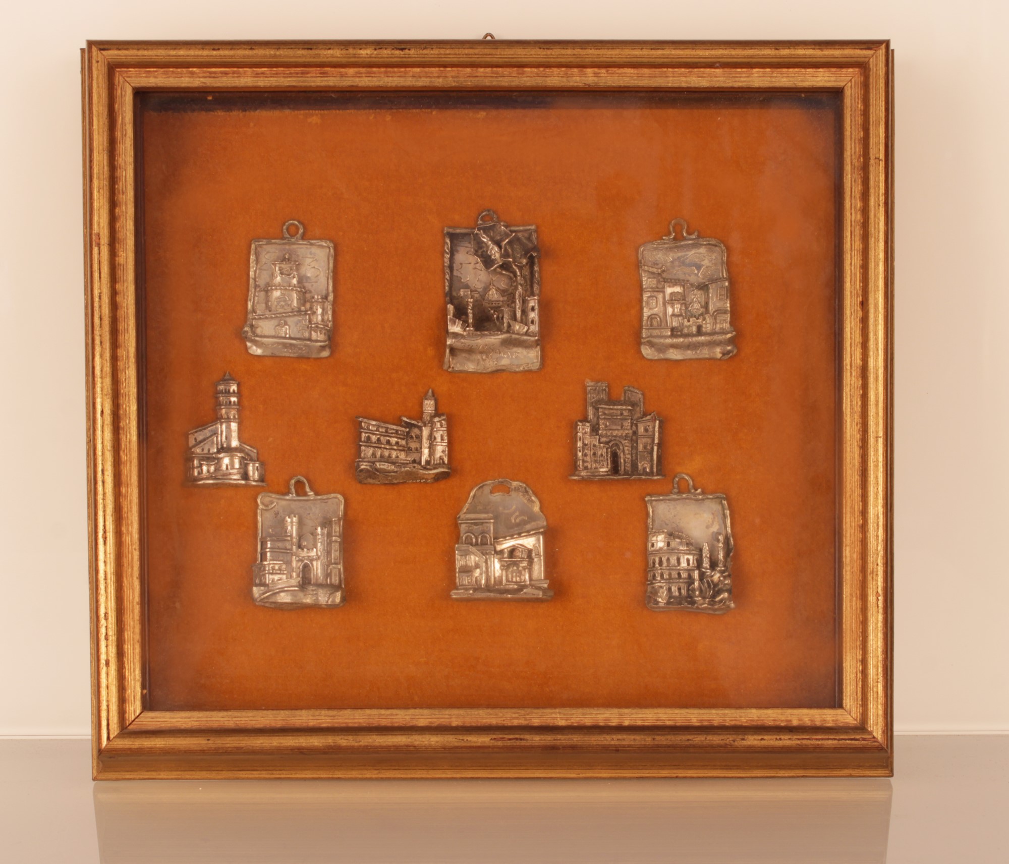 Collezione di nove souvenir in argento (sei de quali da appendere), Ricordo degli Anni Santi a Roma applicati su velluto ed in cornice dorata.