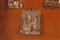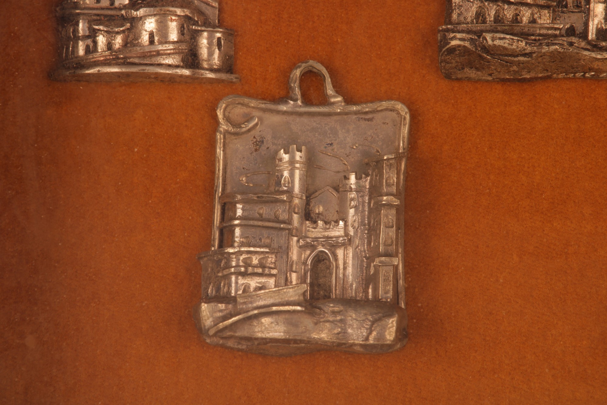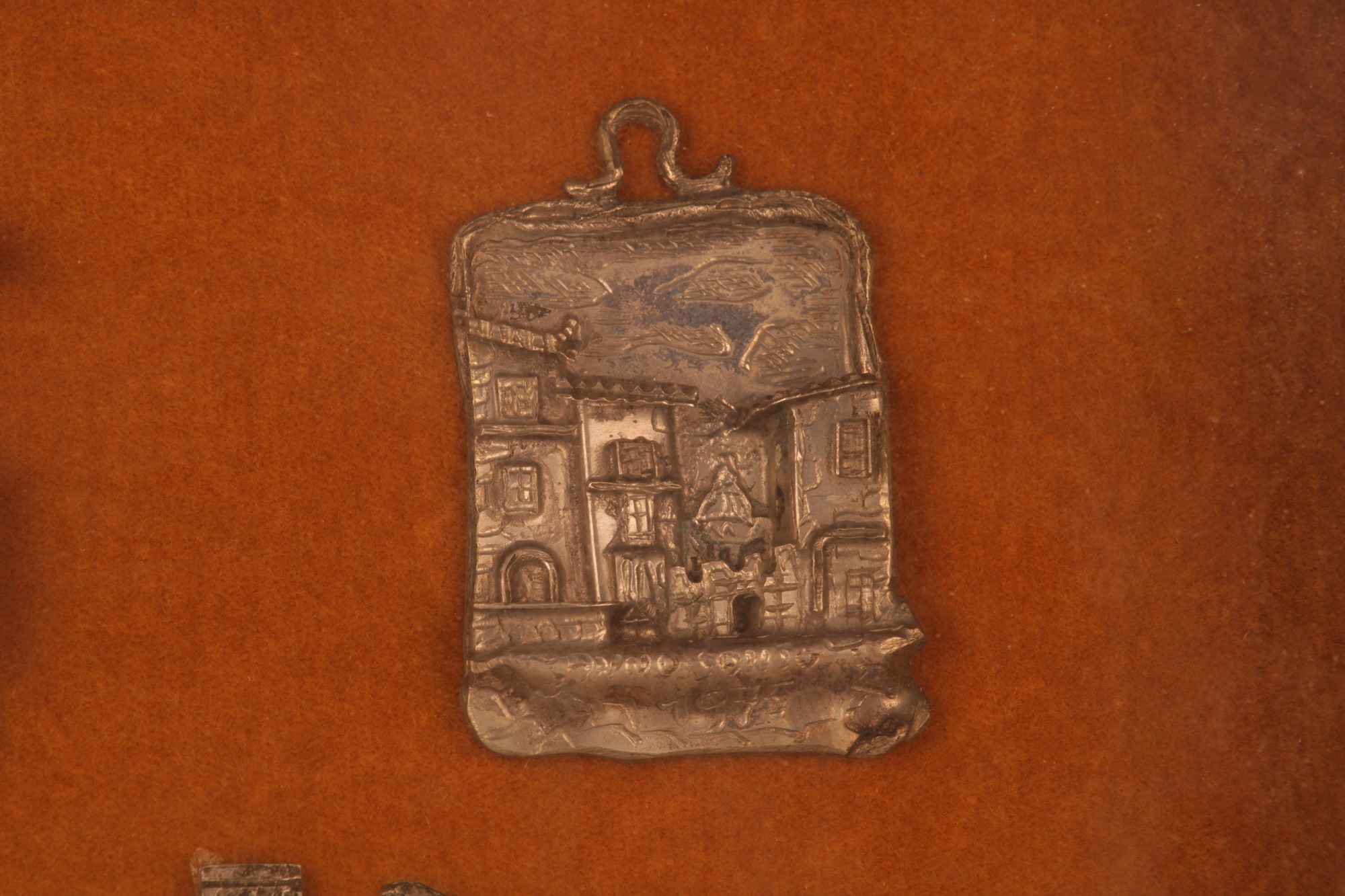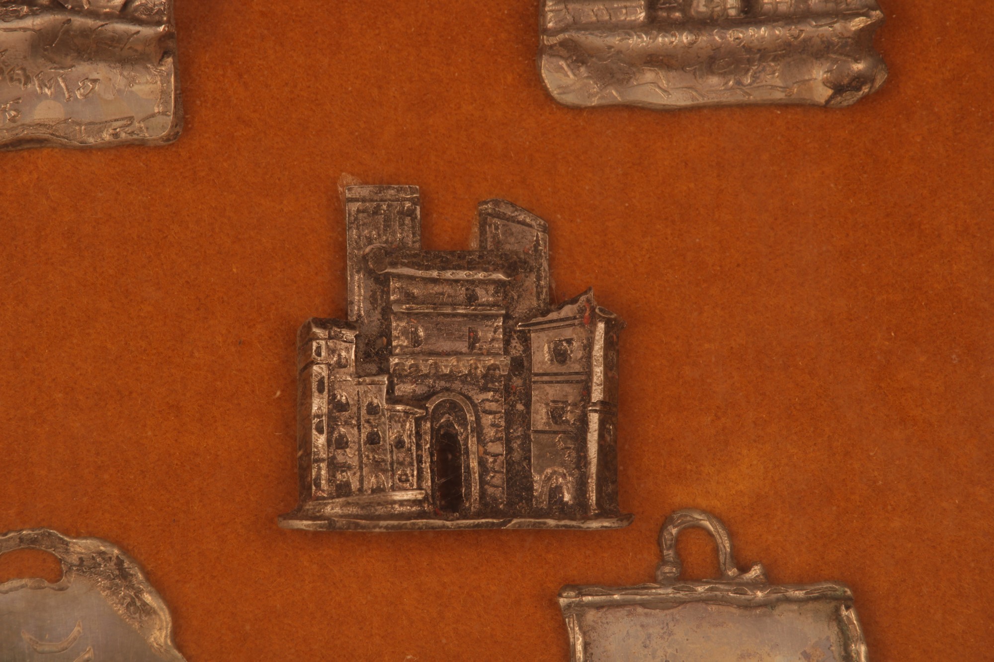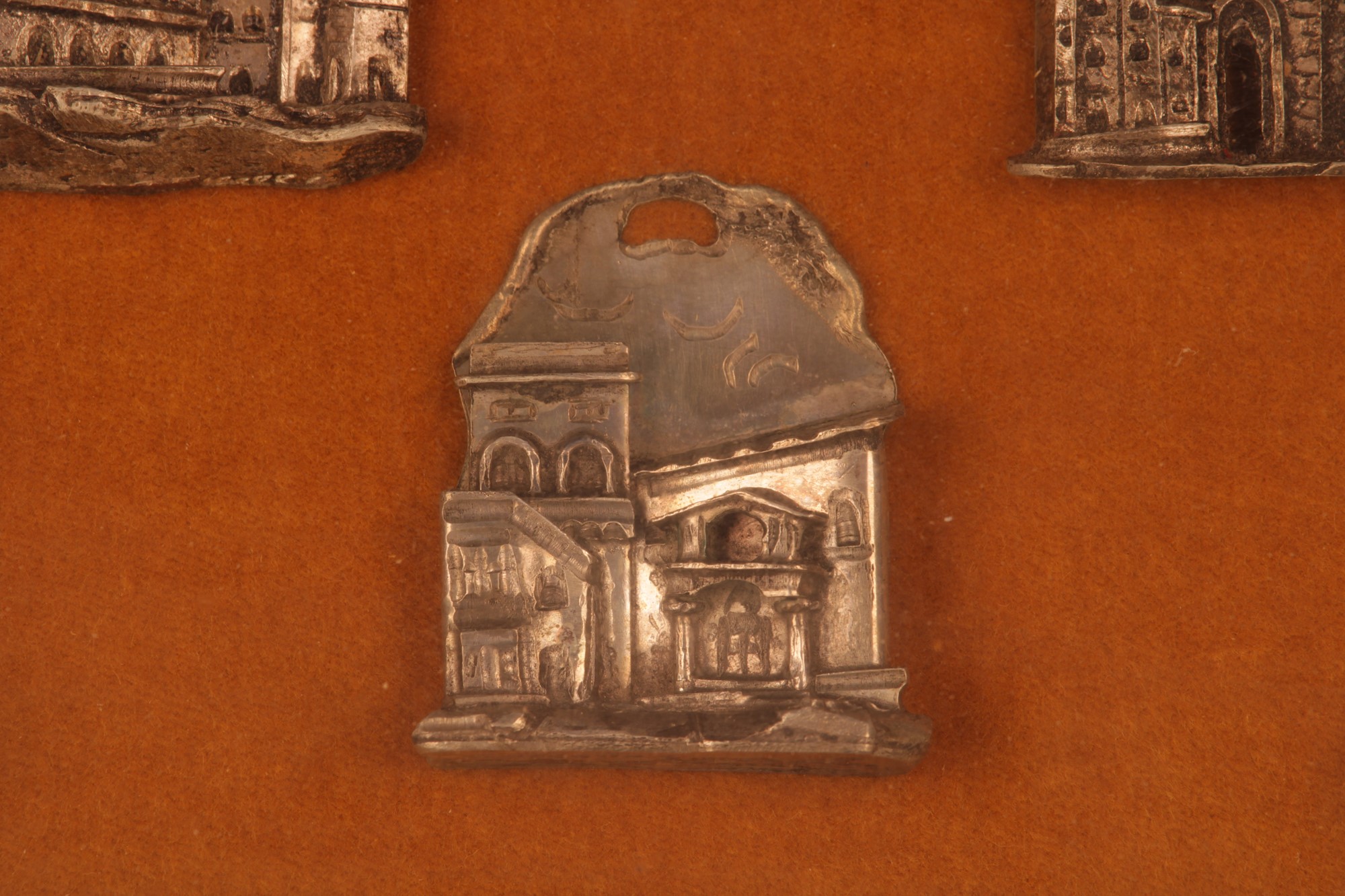 Collezione di nove souvenir in argento (sei de quali da appendere), Ricordo degli Anni Santi a Roma applicati su velluto ed in cornice dorata.