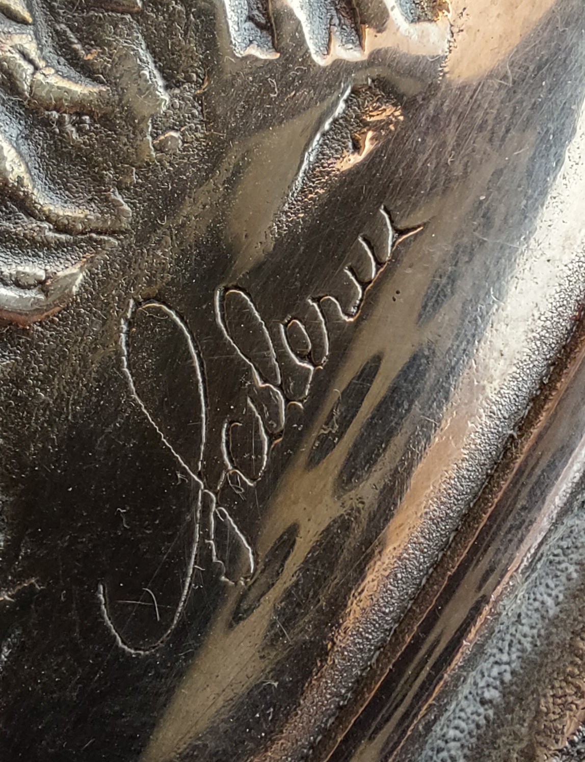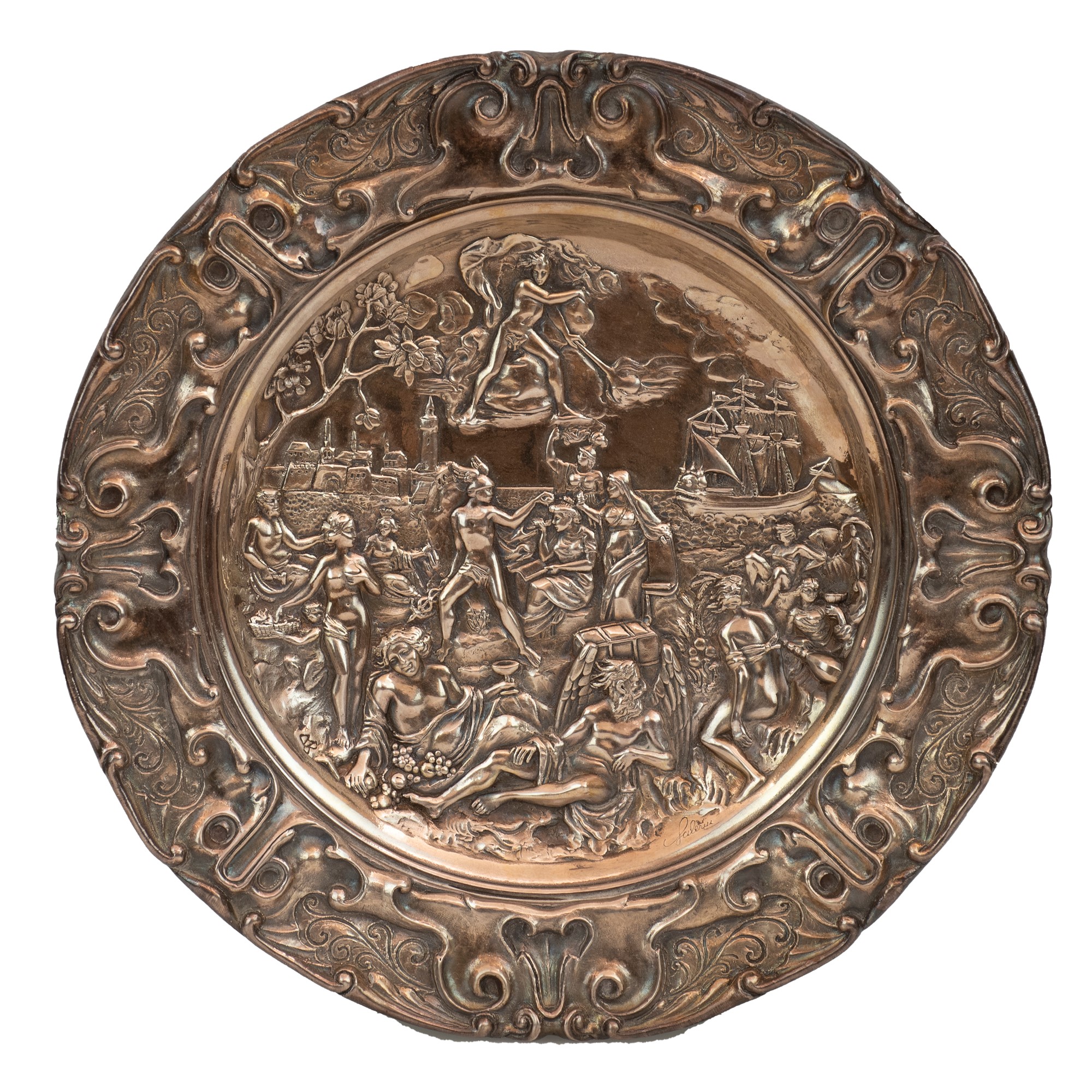 Importante piatto in lamina di metallo argentata finemente sbalzato. Decoro fogliato nella tesa e con scena mitologica nel cavetto. Tra tesa e cavetto la firma "Salerni". Manifattura italiana del XX secolo.