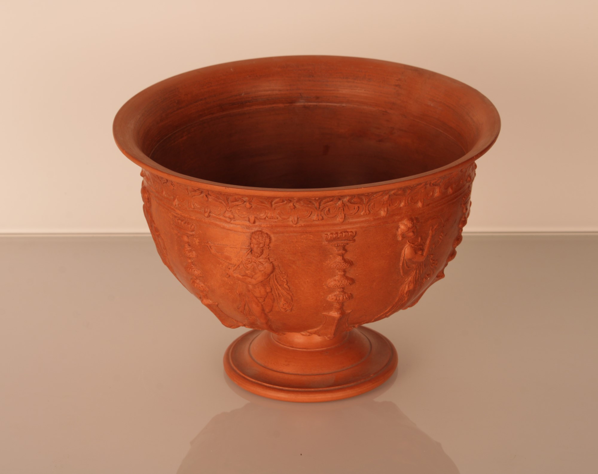 Manifattura fiorentina della fine del XX secolo. Piccolo cratere corallino della tradizione ceramica etrusco-romana, interamente decorato con scene di suonatori nell'ultima decade del '900.