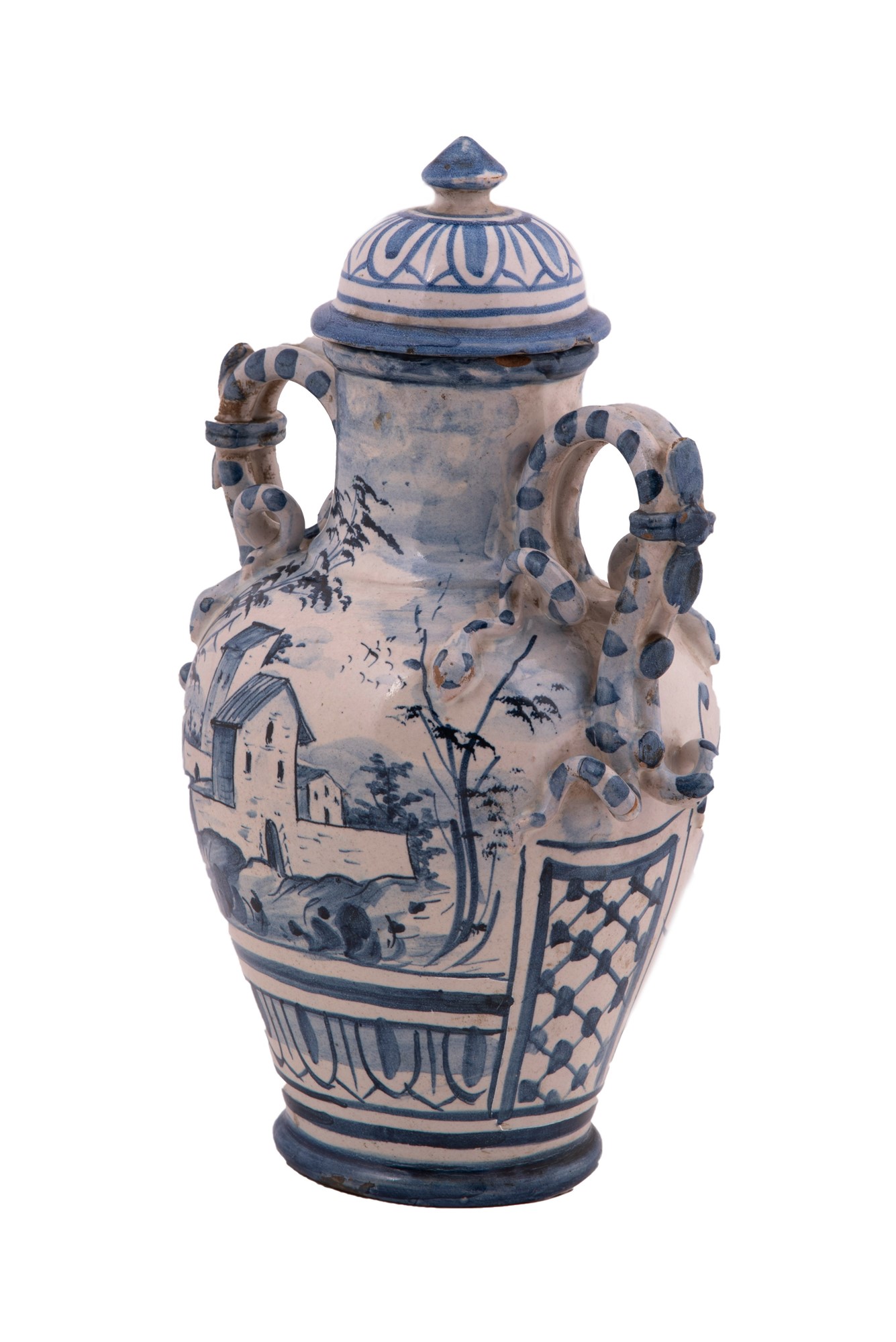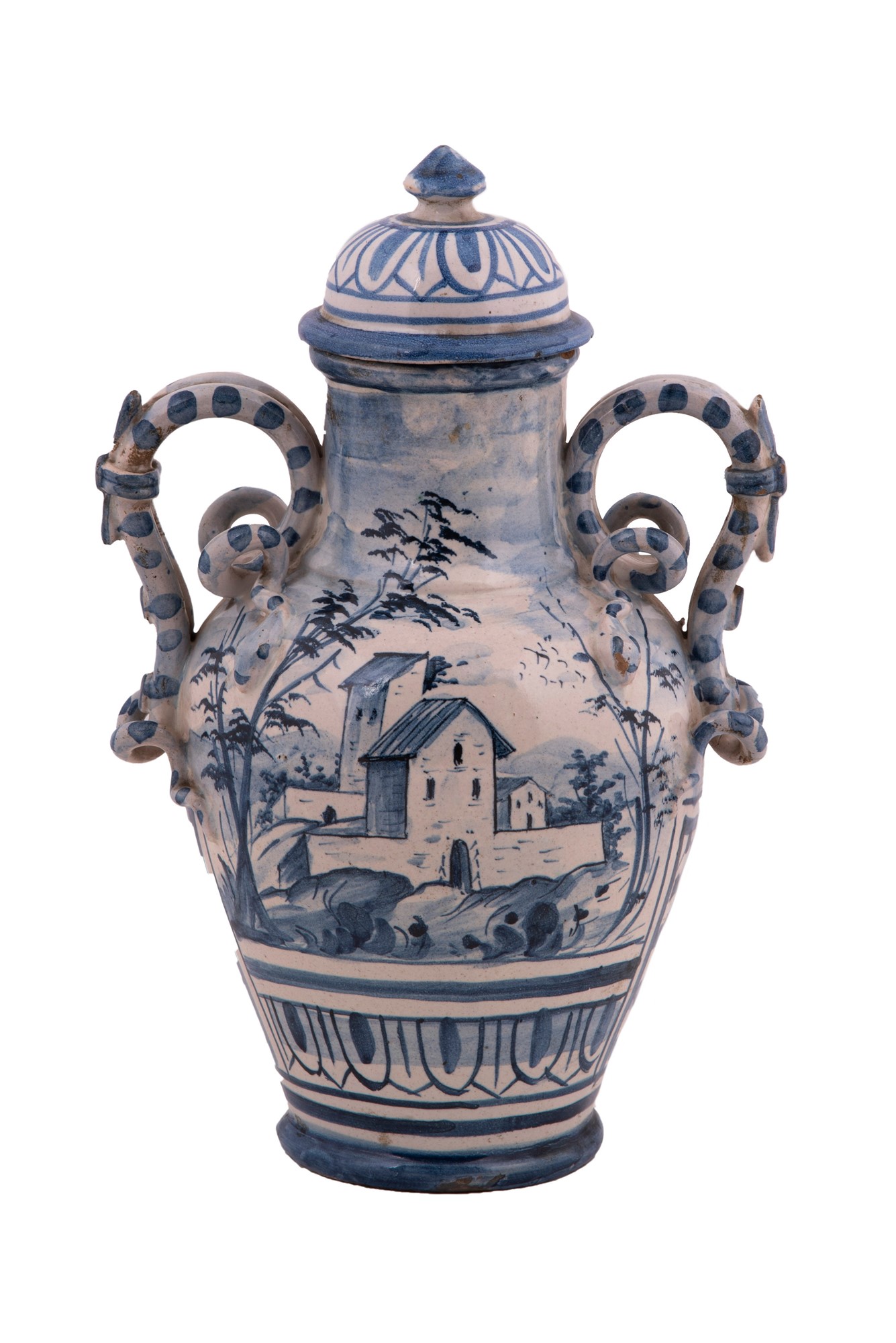 Coppia di vasi Savona con coperchio in ceramica bianca e blu XVIII secolo