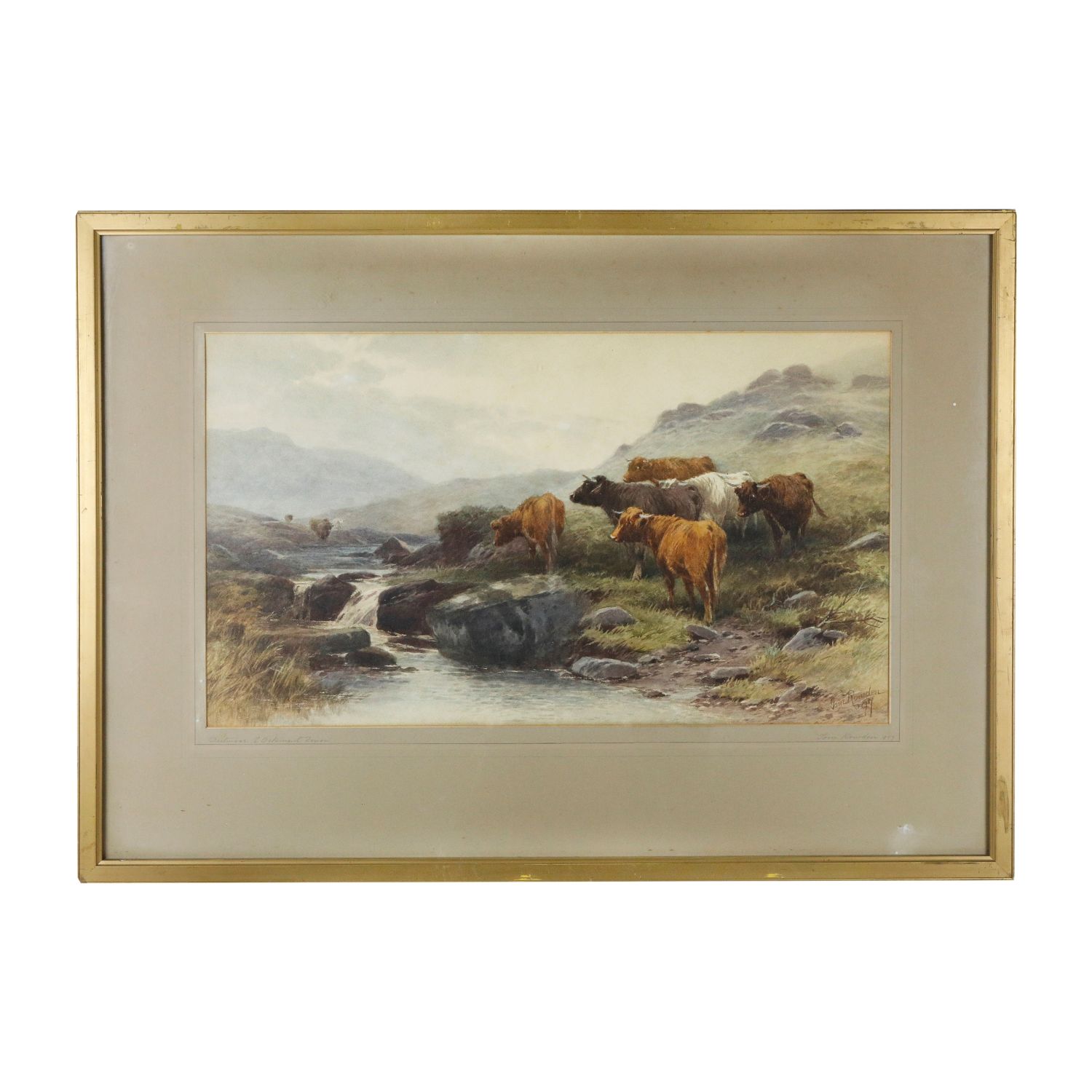 Scorcio di paesaggio montano con mucche seconda metà XIX secolo acquarello su carta 30x 50 cm