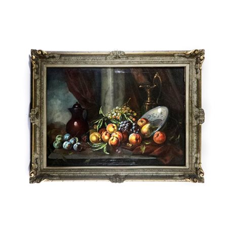 Natura silente composizione con frutta e vasellame metà XX secolo dipinto ad olio su tela 70 x 100 cm