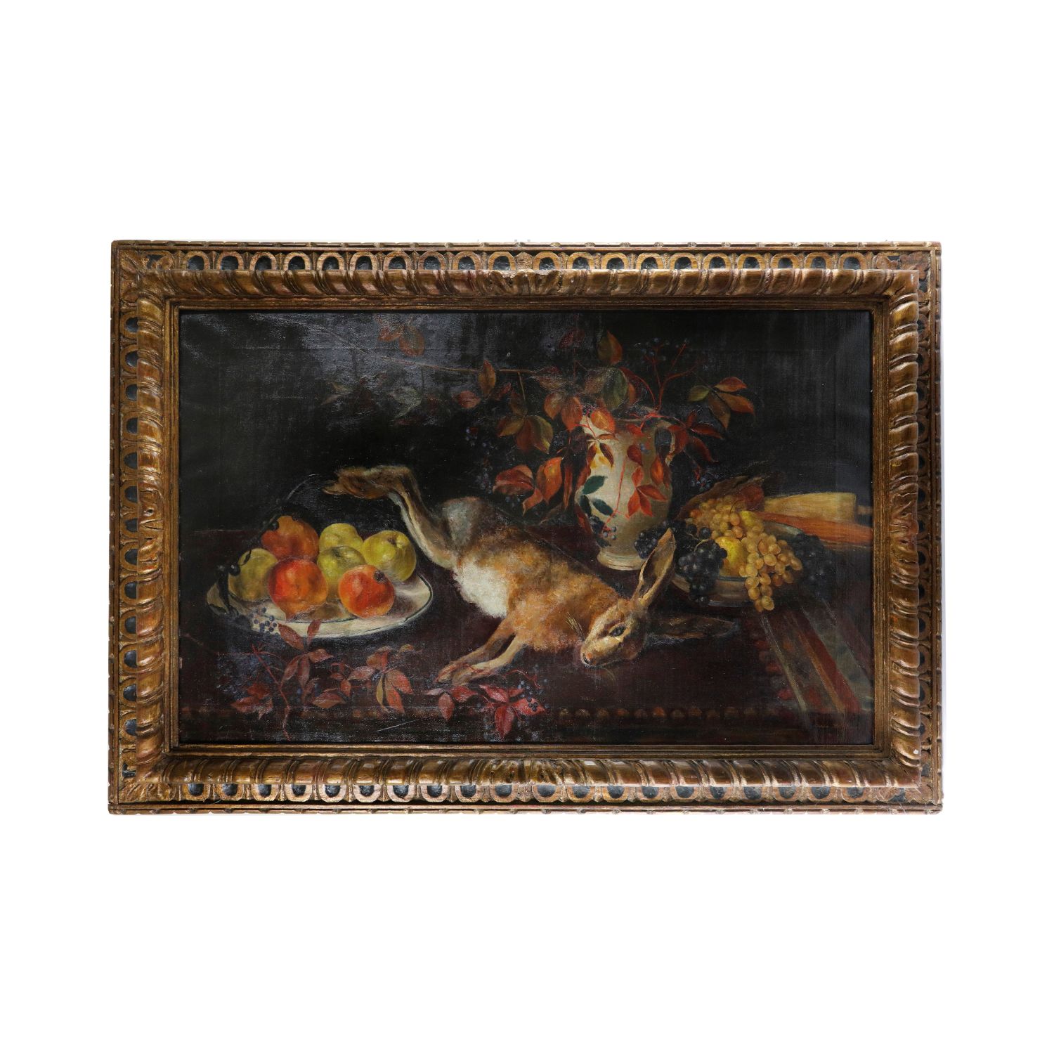 Natura silente con fiori, frutta, vasellame e lepre seconda metà XIX secolo