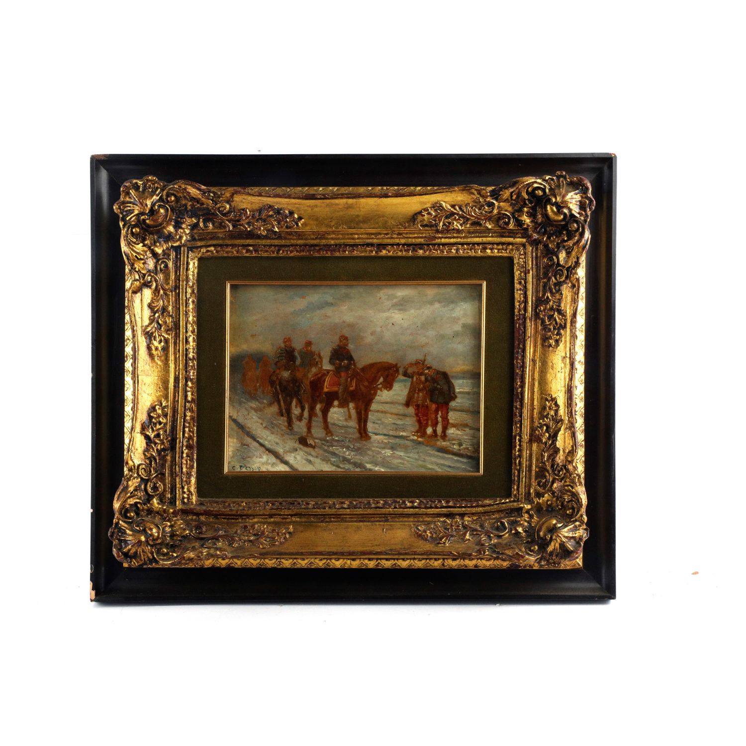 Militari in inverno inizio XX secolo dipinto ad olio su tela 18,5 x 23 cm
