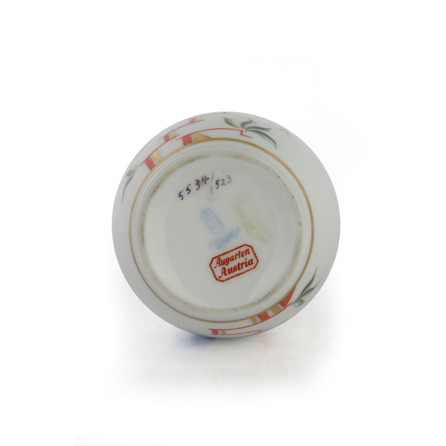 9 x 3,5 cmdecoro a fiori con elementi geometrici stilizzati, finiture in oro zecchino. Forma a balaustro con fondo leggermente ribassato, manifattura di Augarten. Marchio della manifattura in rosso e blu con numeri di serie sottosmalto alla base.