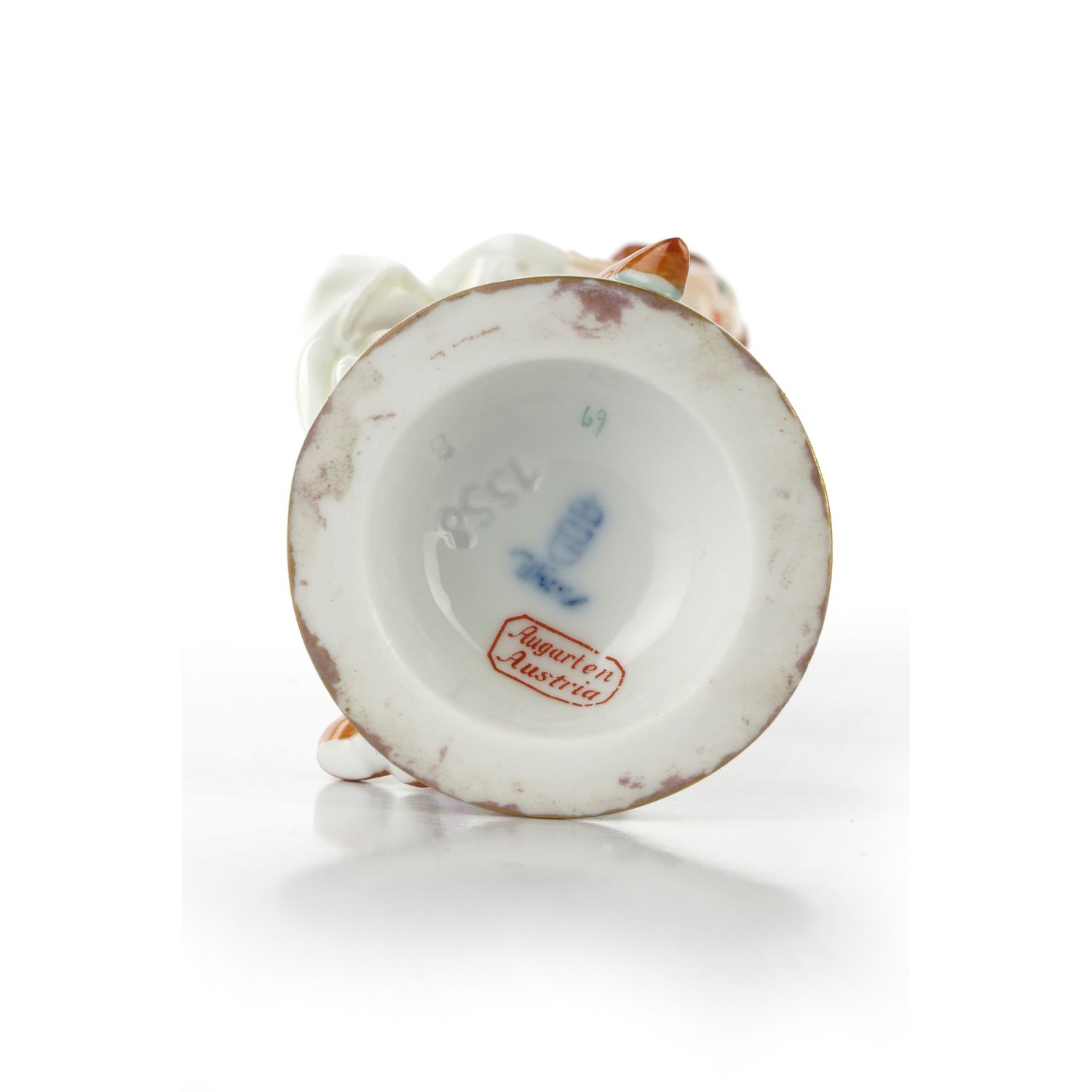 16 x 4,5 cmsu disegno di Mathilde Jaksch. Manifattura Aurgarten Vienna, marchio in blu e rosso alla base sottosmalto, sigle numeriche dell'autore e decoratore incusse nella pasta.