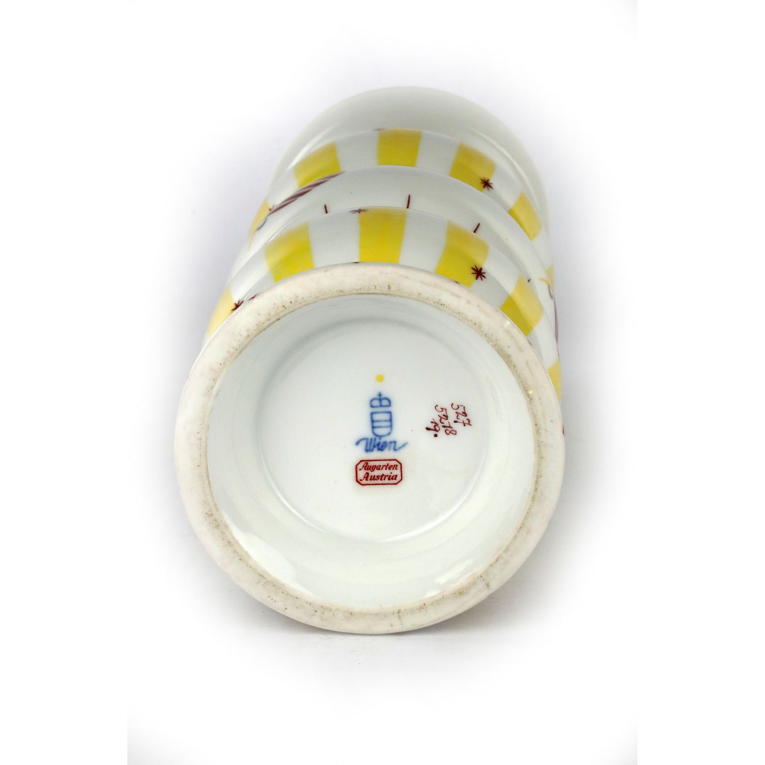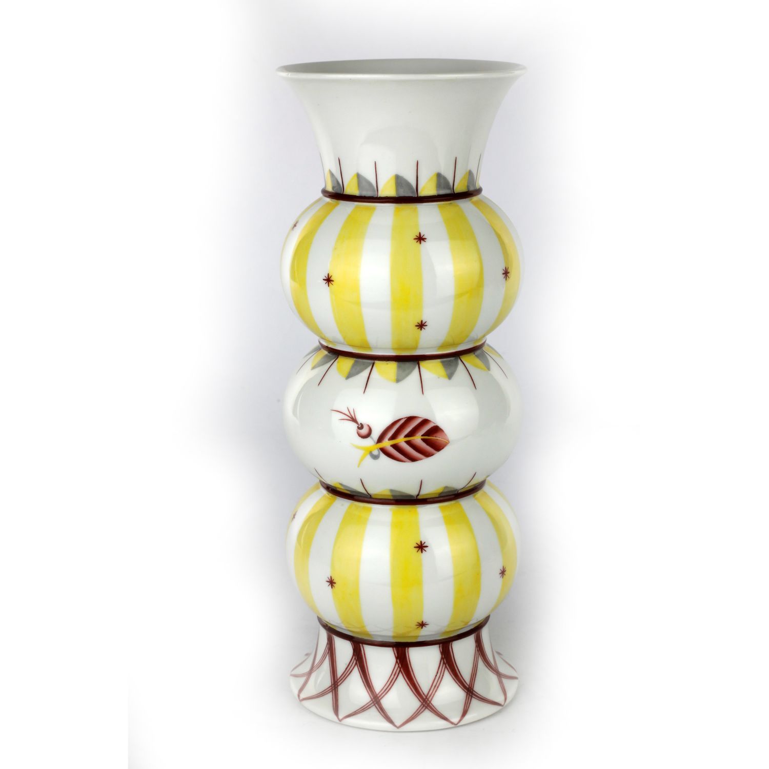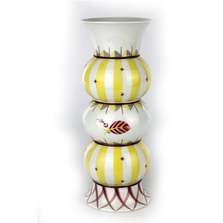 24,5 x 9 cmcorpo a 3 anelli con base e collo svasati, decoro stilizzato a bande verticali e foglie. Su disegno di Otto Prutscher manifattura Augarten Vienna. Marchi di fabbrica in blu e rosso con numeri della seria dell'autore e del decoratore sottosmalto alla base.