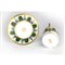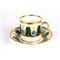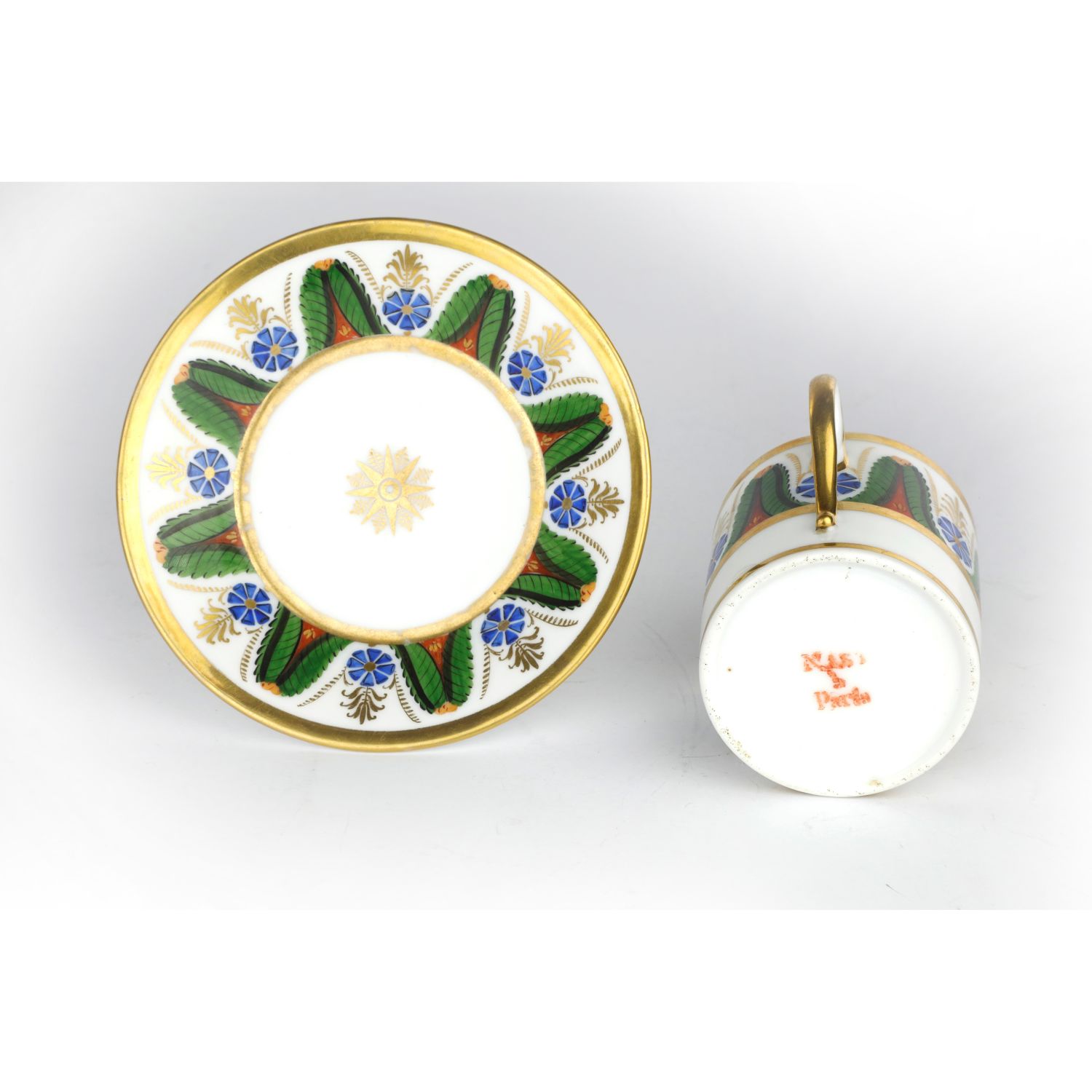6,4 x 6 cm tazza 12,5 x 2,3 x 7 cm piattolitron con ansa ad orecchio, piatto con alto bordo a fondo ribassato. Decoro sul corpo della tazza a palme stilizzate nei colori verde, porpora e bleu con finiture in oro zecchino. Piatto con decoro nella tesa identico a quello della tazza entro riserve dorate. Motivo a stella ad otto punte in oro zecchino nel centro del piatto, manifattura di Nast a Parigi, con firma in porpora sottosmalto. Lieve usure nella doratura
