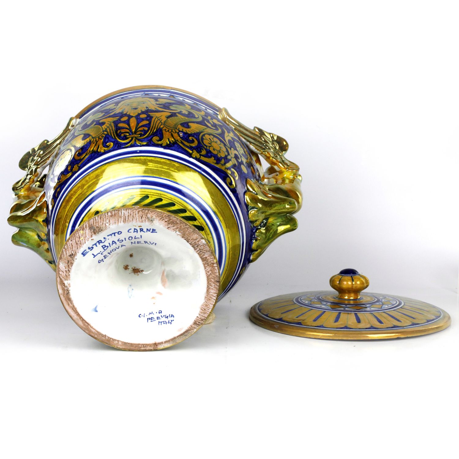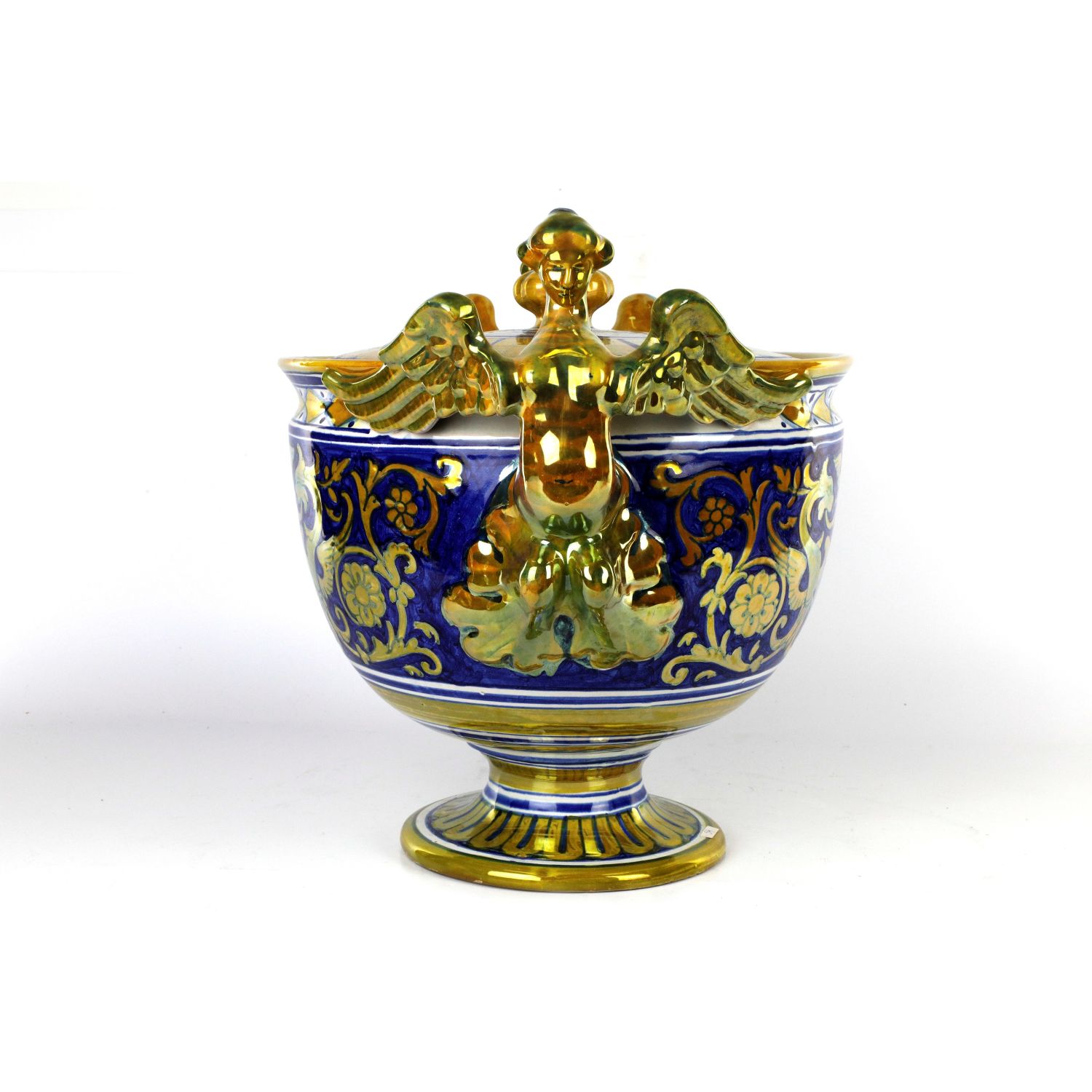 35 x 18 cmanse ad arpia, corpo globulare piede a disco. Decoro a mascheroni ed animali fantastici in oro su fondo bleu, consorzio Cima Perugia. Firma con dedica sotto al piede