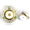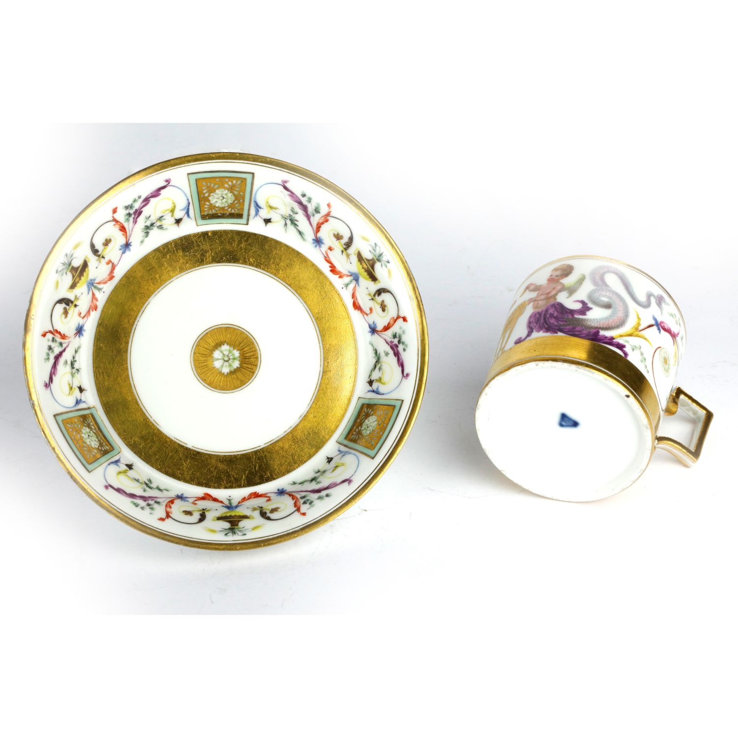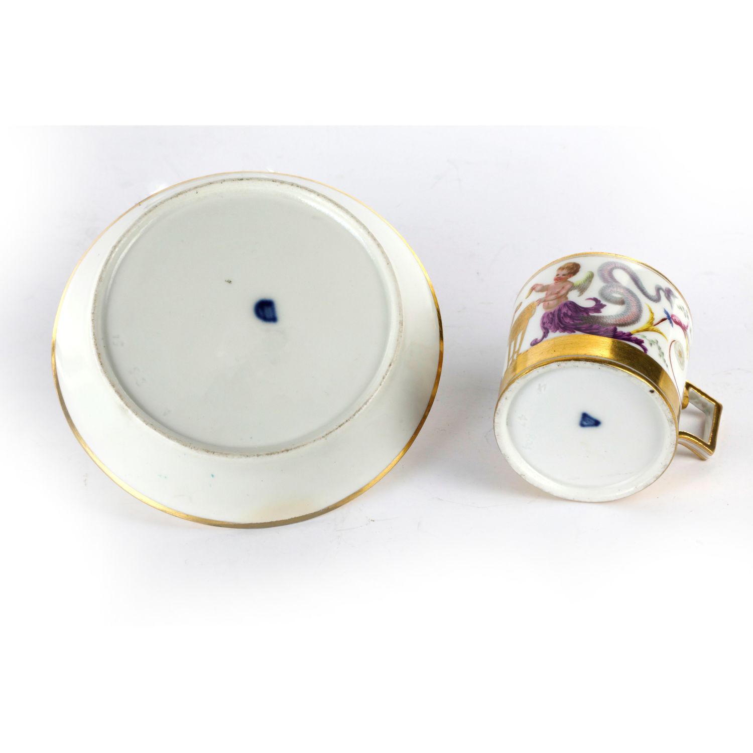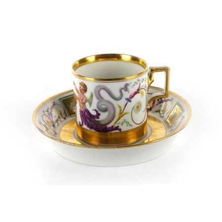 6,1 x 6 cm tazza e 13,5 x 2,6 x 10 cm piattodi forma litron con ansa rettangolare squadrata, piatto ad alto bordo con fondo ribassato. Tazza decorata nel corpo con 2 Eroti sacrificanti su un tripode e con code di animali fantastici; finiture a fascia continua alla base ed al bordo della tazza in oro. Piatto con al fondo decorazione anulare in oro zecchino che fa da riserva una raggiera centrale. Lungo la tesa 3 riquadri in oro con fiore bianco che separano 3 decorazioni a motivi naturalistici stile grottesche. Alla base del piatto e della tazza incussi nella pasta data di fabbricazione e del modellatore. In blu sottosmalto marchio della manifattura imperiale di Vienna conduzione Sorgenthal