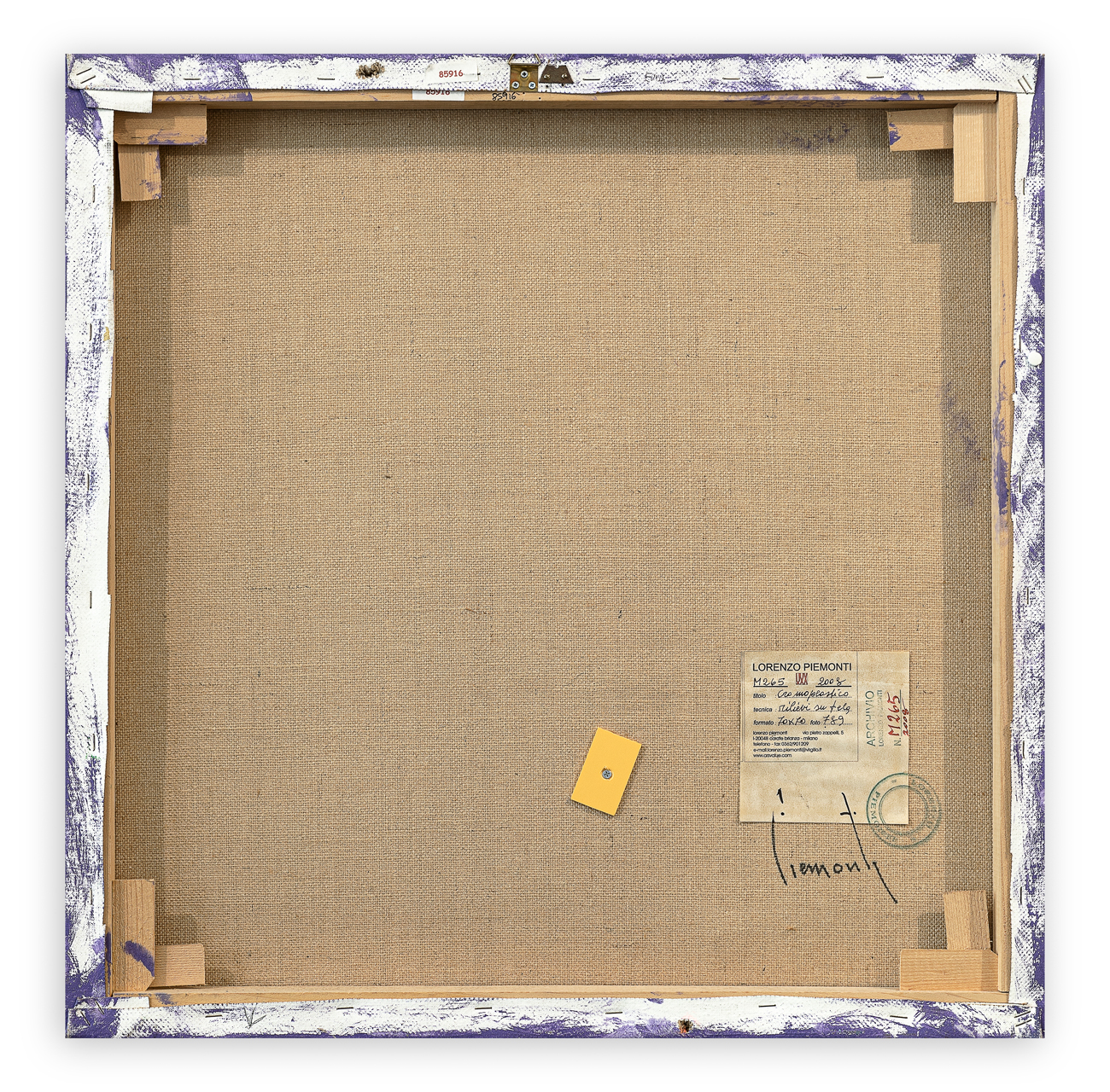 Etichetta dell'Artista al retro con firma, timbro, numero di repertorio e caratteristiche tecniche dell'opera