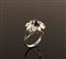 Anello in platino con al centro incastonato uno zaffiro cabochon per carati 1,20 circa, circondati da diamanti taglio a goccia per carati 2 circa e diamanti taglio brillante per 0,20 punti circa, gr. 7,9.
