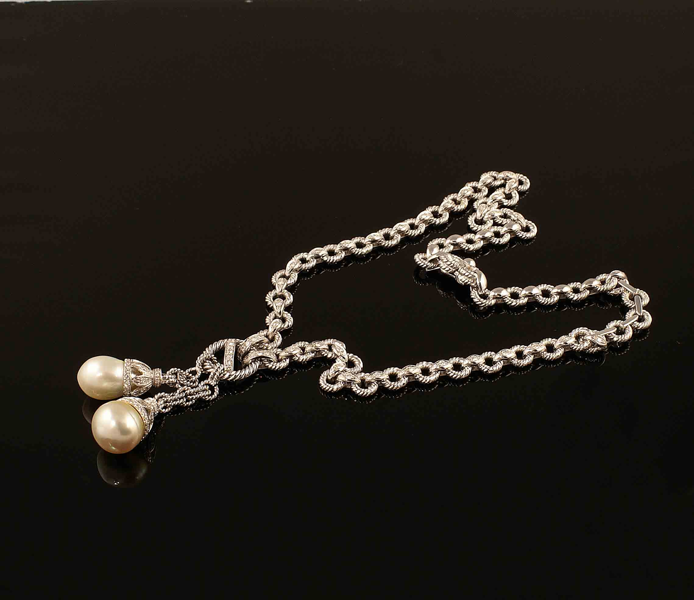 Lunga collana in oro bianco 18kt maglia a cordoncino con incastonati diamanti taglio brillante per carati 1,40 circa e due perle coltivate rispettivamente di mm. 12 e mm. 14, gr. 61,9.