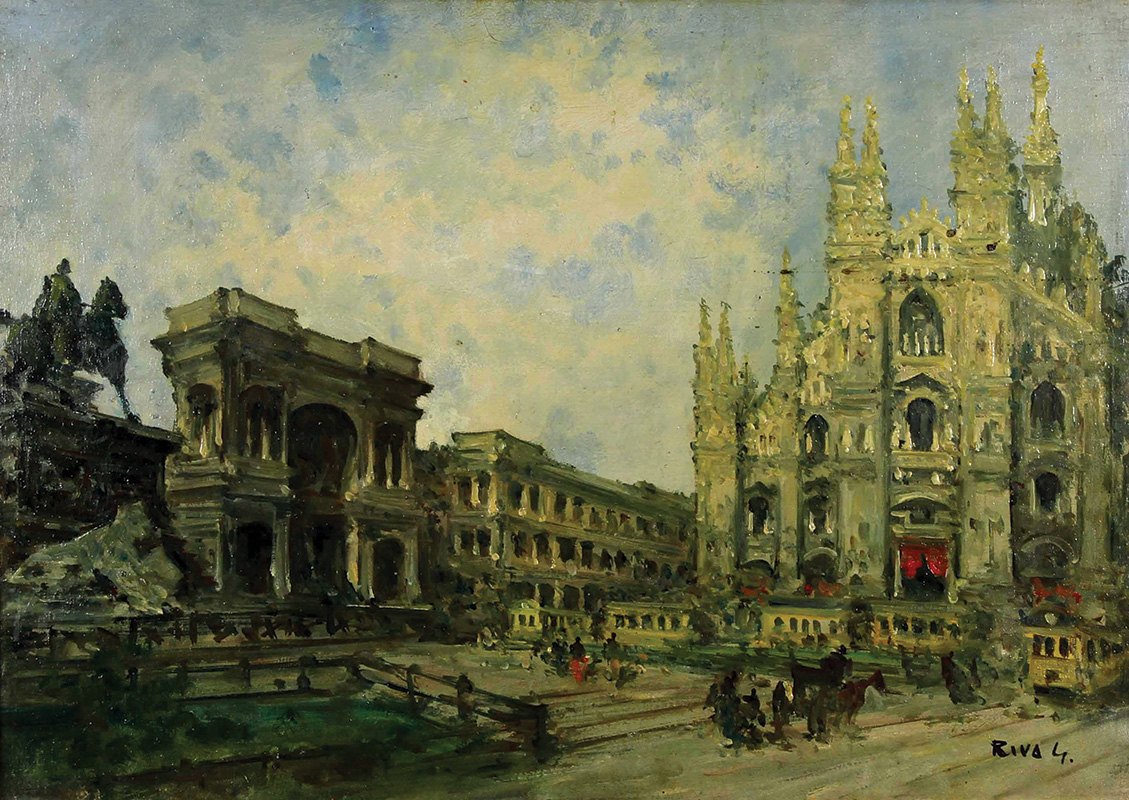 Zangli Fortunato Il Duomo di Milano olio su tela, cm. 50x70 firmato in basso a destra, al retro etichetta dell'Esposizione "Estate 1968" tenutasi presso la Galleria degli Angeli di Riccione, timbro GR sul telaio al retro
