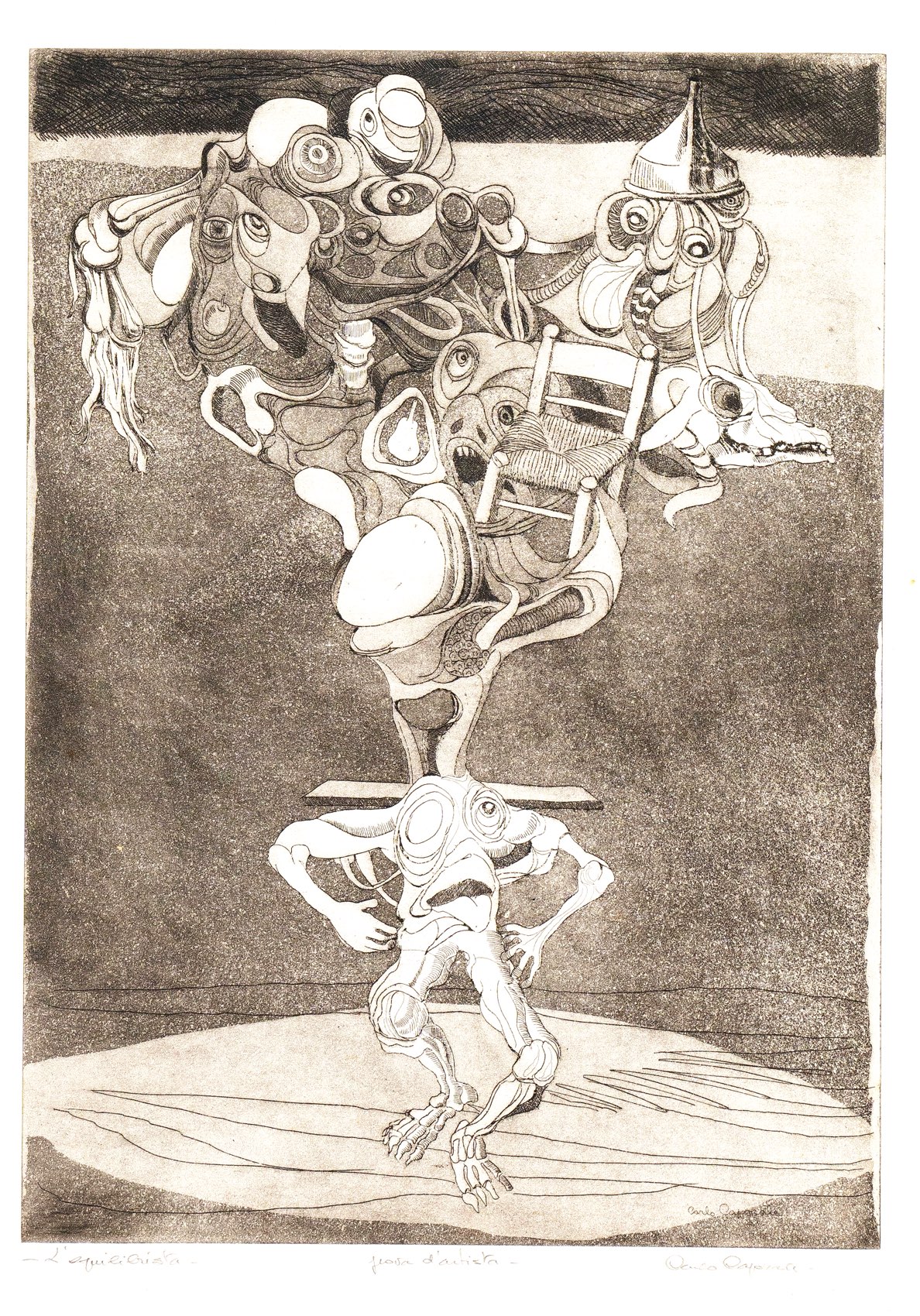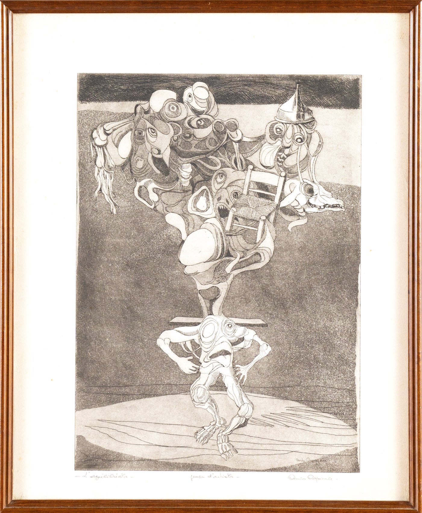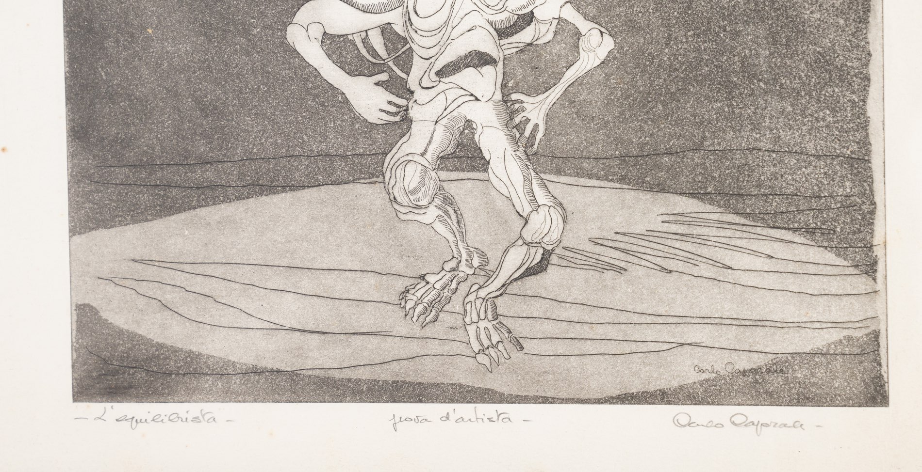 Carlo Caporale (San Giovanni in Persiceto 1923 - San Benedetto in Val di Sambro 2000), “L’equilibrista”. Litografia su carta esemplare prova d’artista, firmata in basso a destra, presenta titolo in basso a sinistra, Lastra H cm 34x25