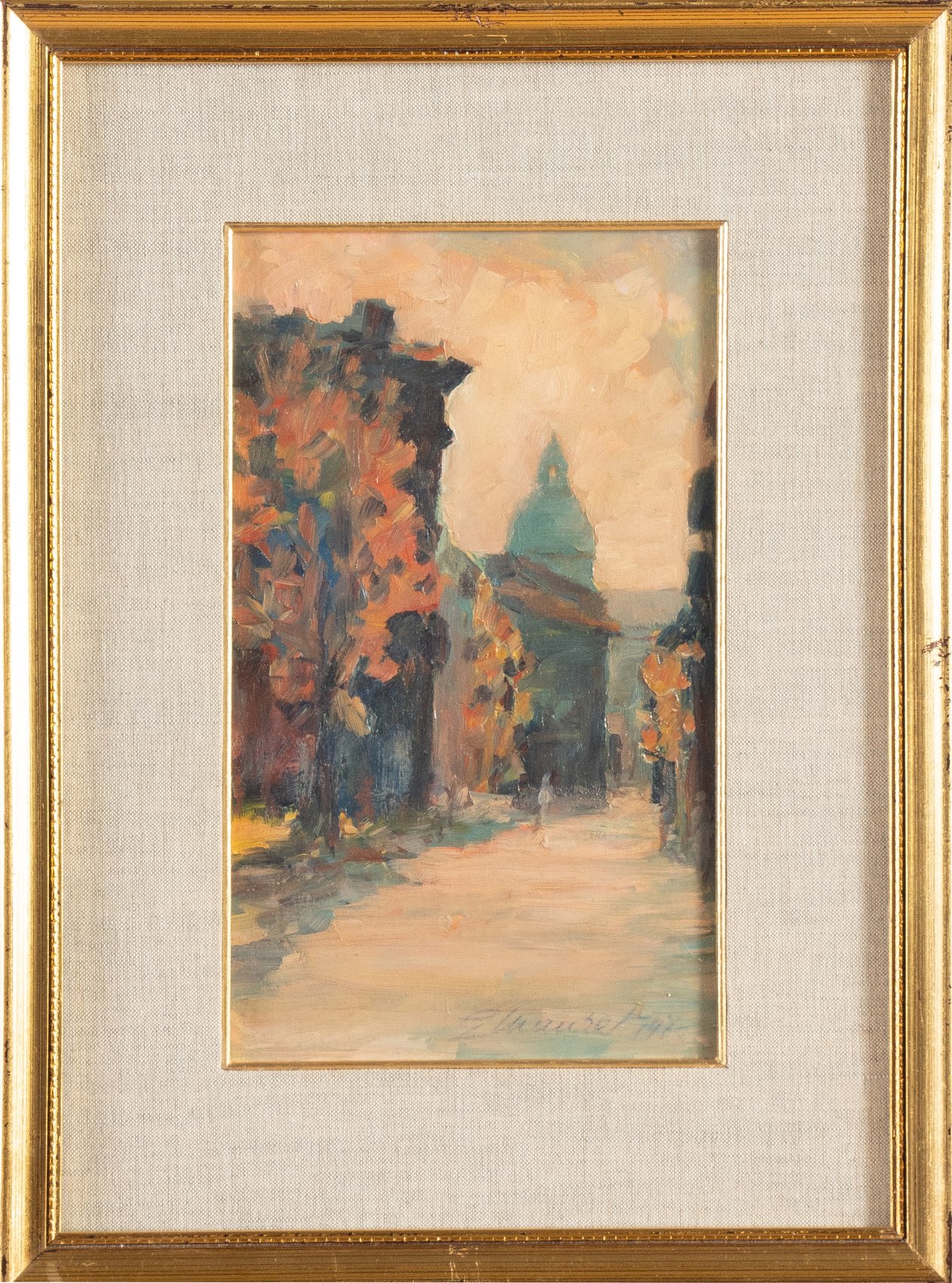 Mauret Grimaldi (XX secolo), “Piazza Calderini da Piazza Minghetti - Bologna”, 1970. Olio su cartone telato, firmato e datato in basso a destra, reca al retro firma, data, titolo e timbro dell’artista, H cm 15x25