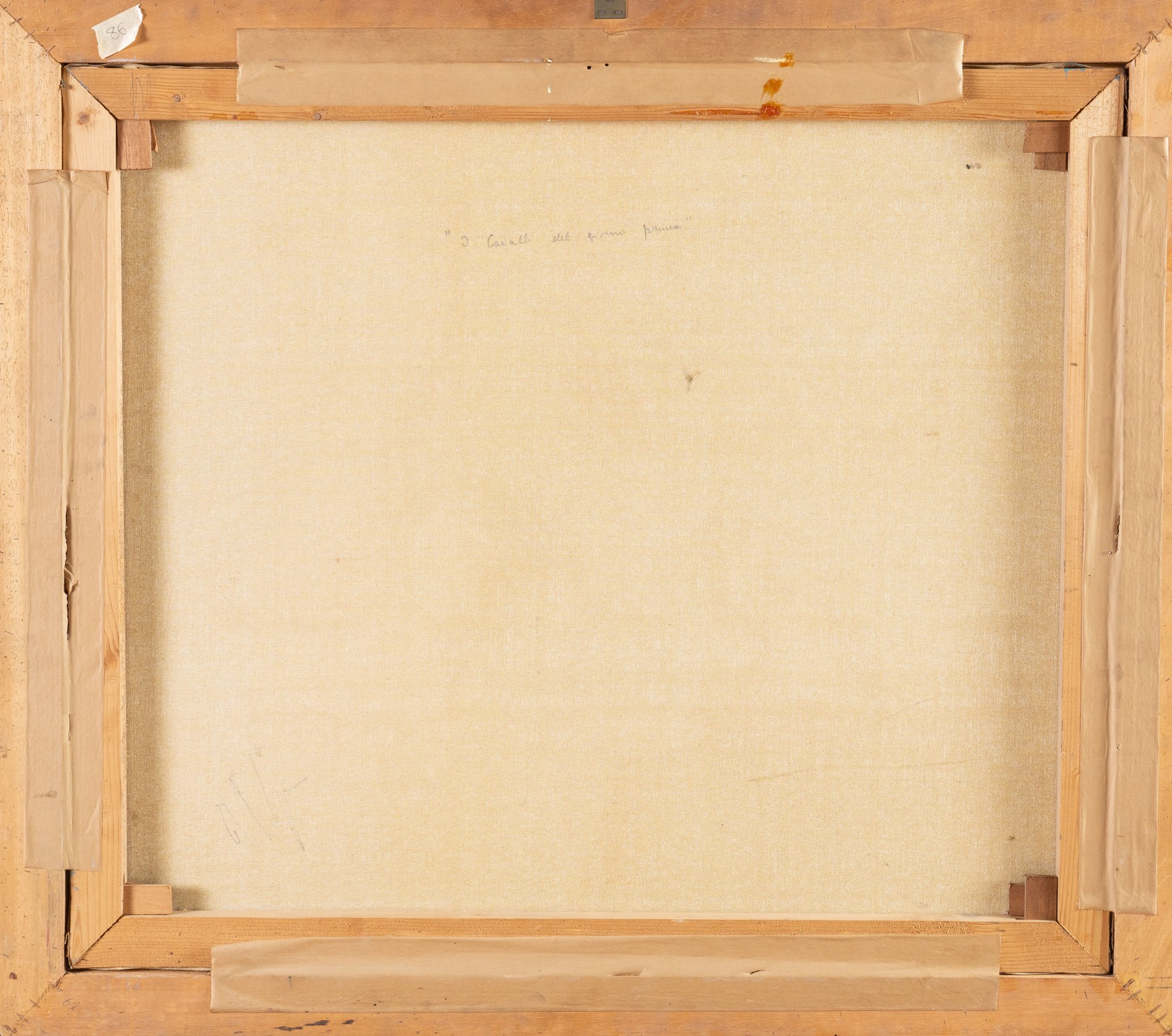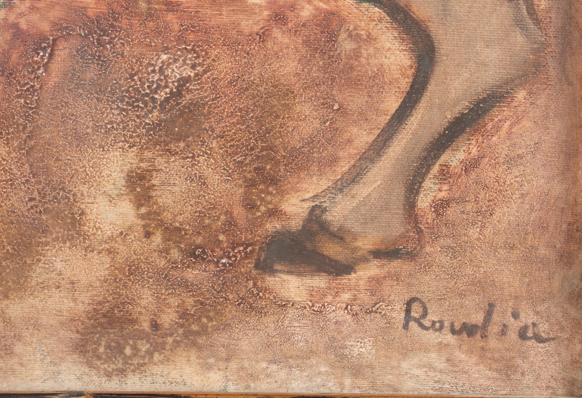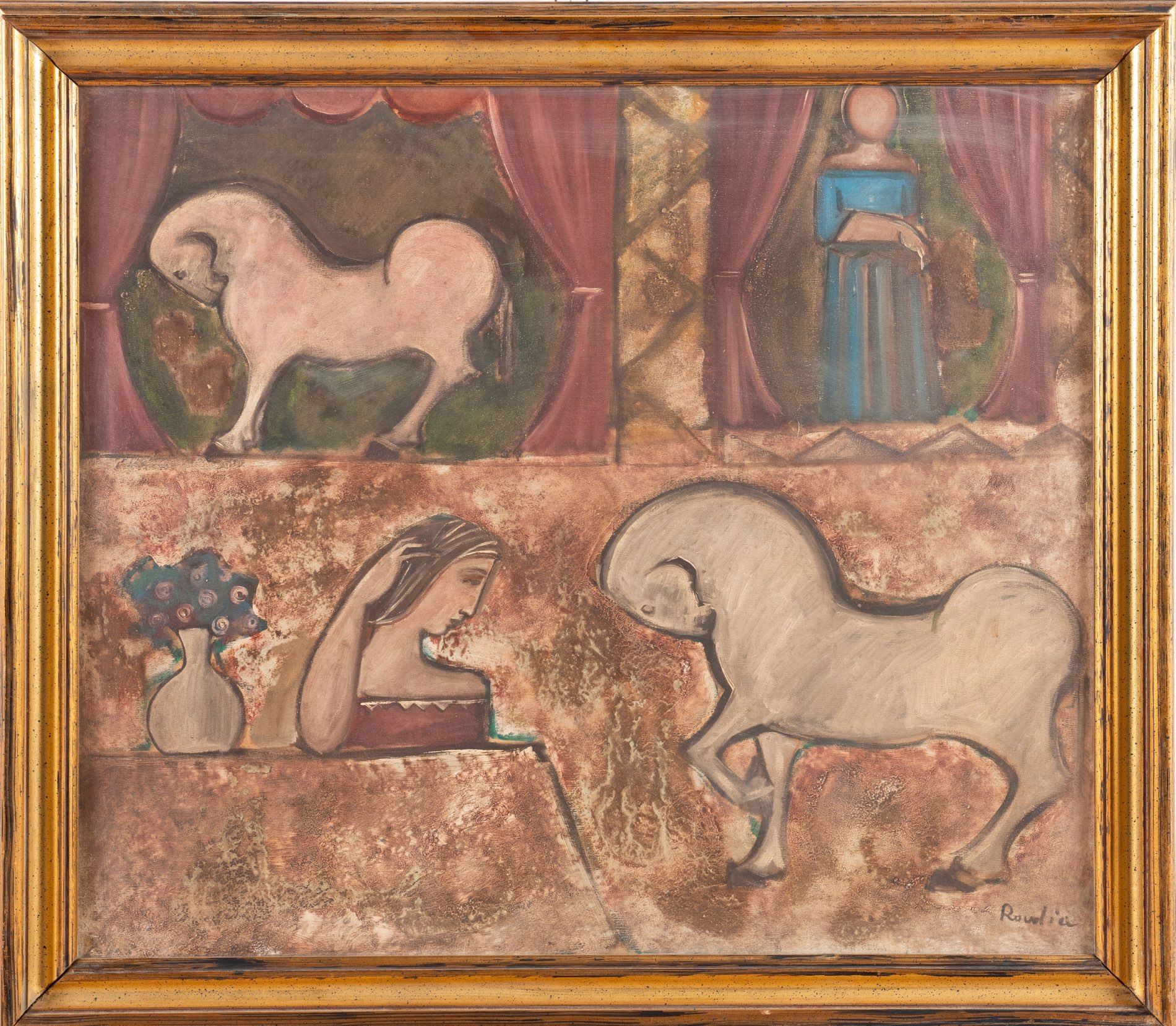 Franco Rivola in arte ROWLIA, “I cavalli del giorno prima”. Olio su tela, firmato in basso a destra, reca al retro titolo, H cm 70x81