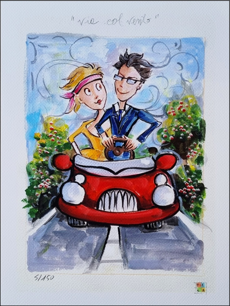 FENA Lecce 1958 "Via col vento" Serigrafia su cartoncino pesante, ritoccata a mano, cm 24x32. Firmata a penna in basso a destra, tiratura a matita 5/150, a sinistra, titolo in alto al centro.