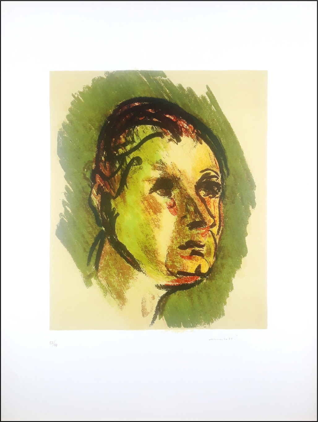MORLOTTI ENNIO Lecco 1910 - Milano 1992 "Autoritratto" Litografia su cartoncino cm 48x63 del 1977. Timbro a secco e firma a matita sul fronte in basso a destra, tiratura 57/99 a sinistra.