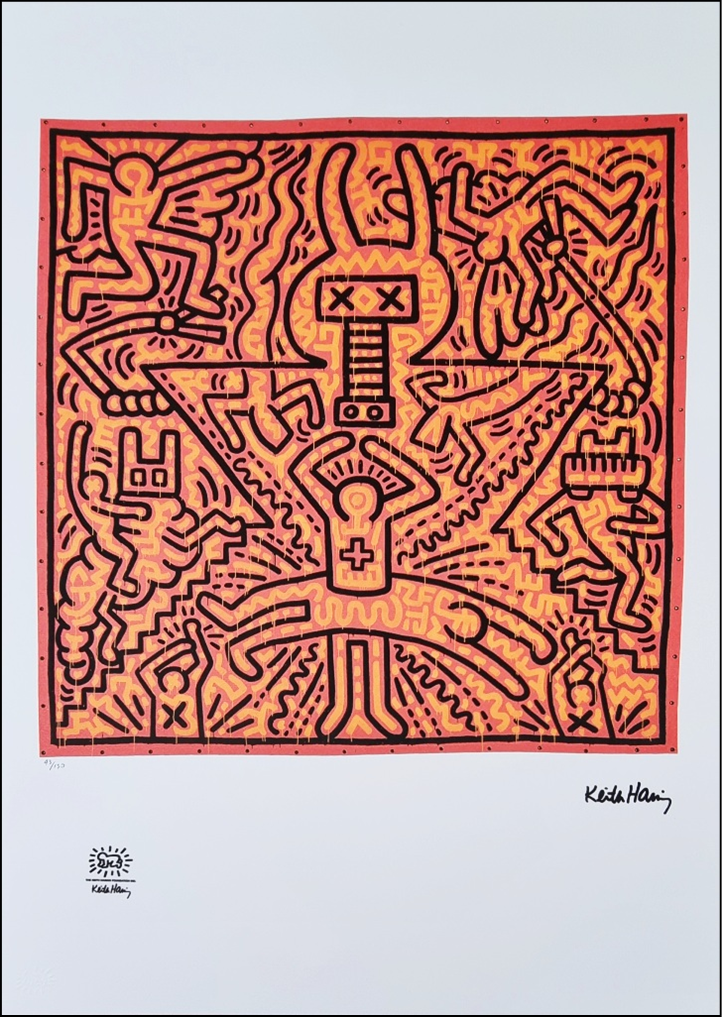 HARING KEITH Pennsylvania 1958 - New York 1990 "Senza titolo" Riproduzione litografica offset cm 50x70. Firma in stampa sul fronte in basso a destra, tiratura 43/150, timbro a secco e timbro in stampa a sinistra.
