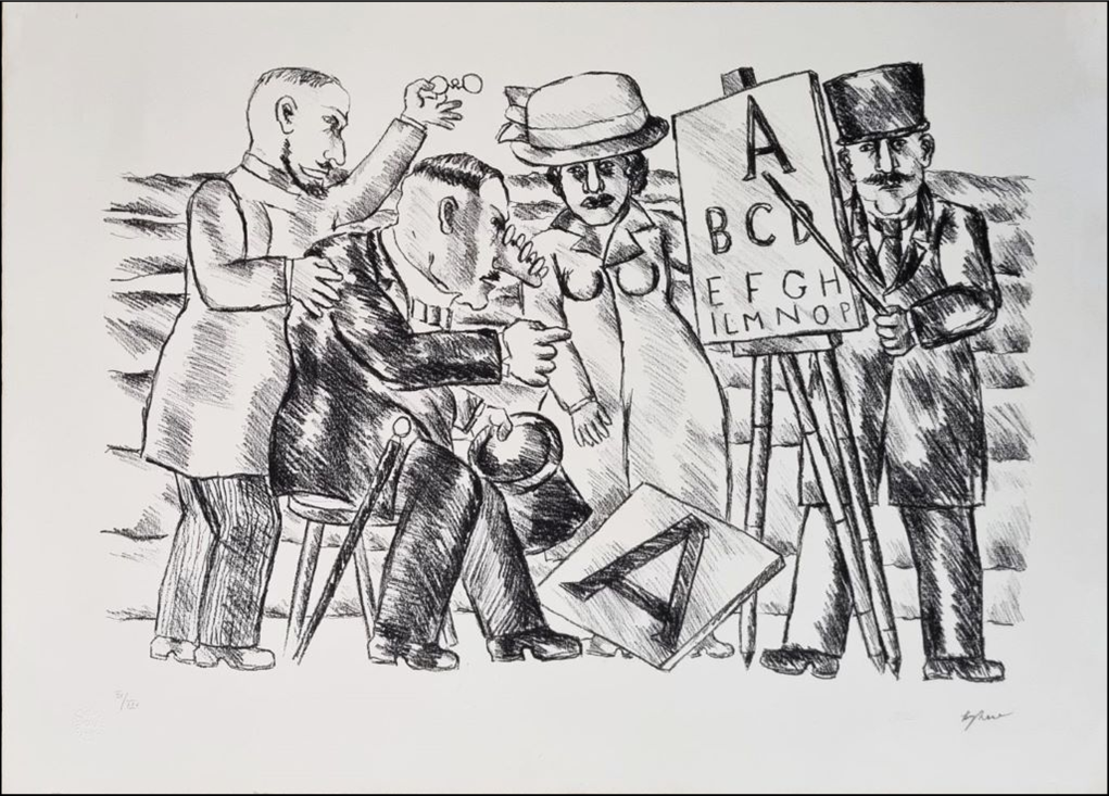 BORGHESE FRANZ Roma 1941 - 2005 "L'oculista" Litografia originale cm 80x57,5. Firmata sul fronte in basso a destra, tiratura XV/XXV e timbro a secco a sinistra. Sul retro timbro di garanzia a cura della Grafica d'arte Lombardi.