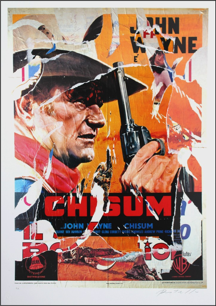 ROTELLA MIMMO Catanzaro 1918 - Milano 2006 "Chisum" Multiplo decollage, strappi di manifesto applicati su supporto serigrafico su cartoncino, cm 70x100. Firmato sul fronte in basso a destra, tiratura P.A. e timbro a secco "Fondazione Rotella" in basso a sinistra. Opera pubblicata sul catalogo "Mimmo Rotella multiplo decollage", Silvana Editore, a pagg. 60 e 61.