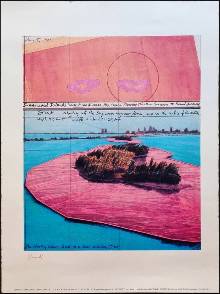 CHRISTO JAVACEV Bulgaria 1935 - New York 2020 "Surrounded Island, Miami 1882" Cromolitografia su carta museale cm 56,5x76, del 1982. Firmata sul fronte in basso a sinistra, esemplare 358. Sul retro timbro di garanzia a cura della Grafica d'arte Lombardi.