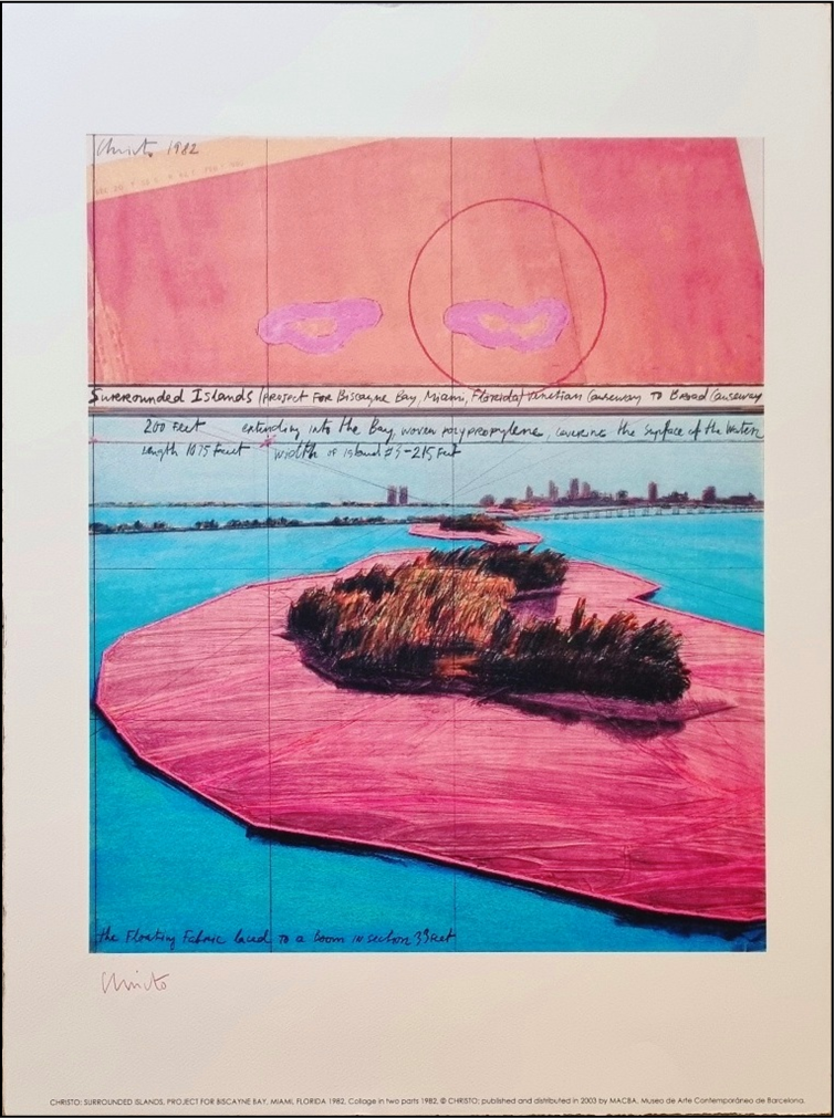 CHRISTO JAVACEV Bulgaria 1935 - New York 2020 "Surrounded Island, Miami 1882" Cromolitografia su carta museale cm 56,5x76, del 1982. Firmata sul fronte in basso a sinistra, esemplare 350. Sul retro timbro di garanzia a cura della Grafica d'arte Lombardi.