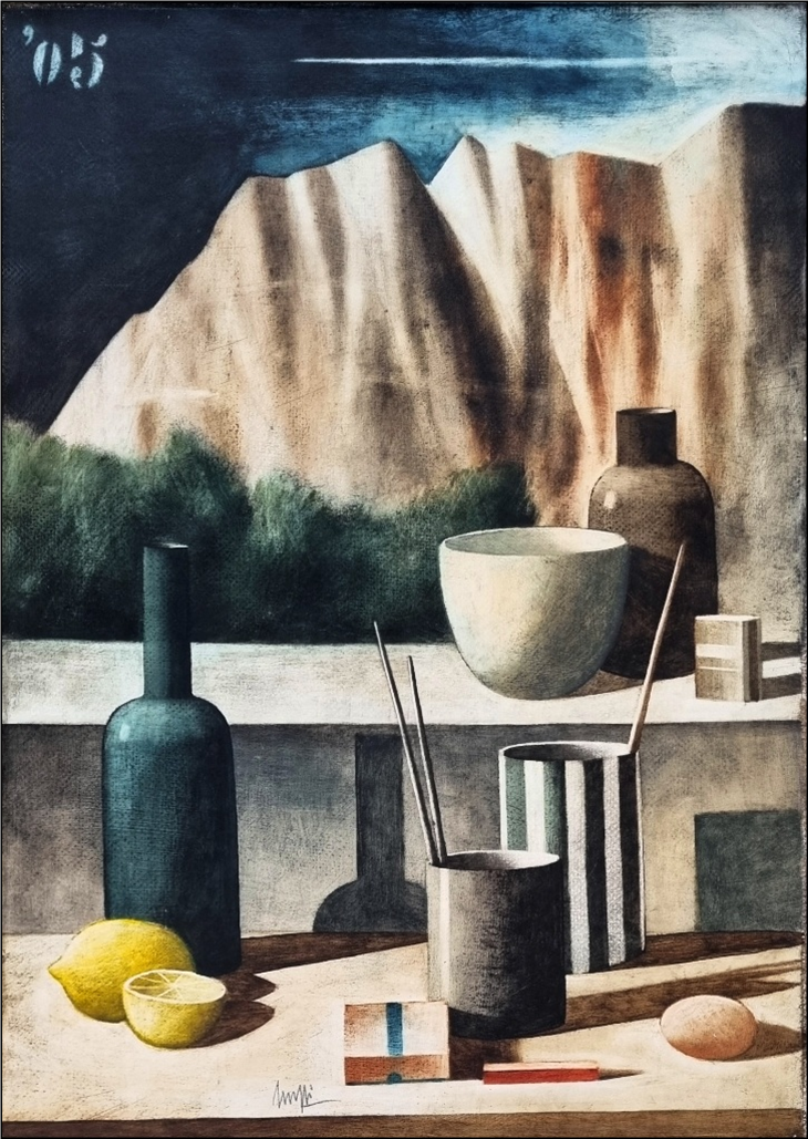 SCUFFI MARCELLO Quarrata 1948 - 2021 "Natura morta e montagna" Olio su tela cm 50x70 del 2005. Firmato sul fronte in basso al centro, datato in alto a sinistra. Sul retro titolo, firma e data. Autentica ed archivio su foto, a cura del maestro, e certificato di garanzia di altra galleria.