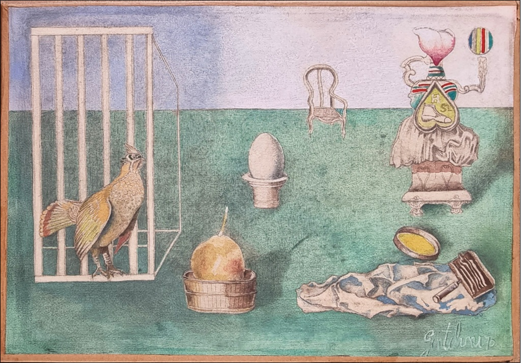 GENTILINI FRANCO Faenza 1909 - Roma 1981 "Oggetti sul prato" Acquerello e collage su carta intelata cm 54x38, del 1970. Firmato e datato sul fronte in basso a destra. Sul retro a sinistra firmato e dedicato. Archivio su foto a cura dello Studio Gentilini.