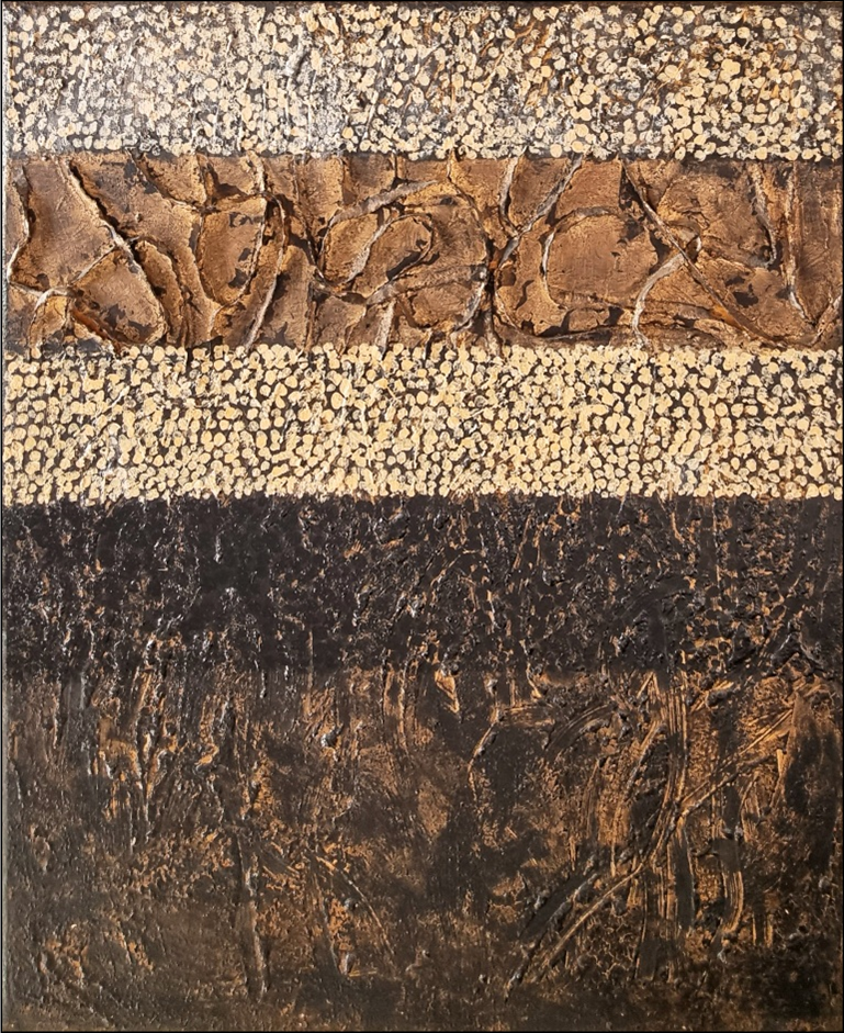 PISANI FRANCA Grosseto 1956 "Minuta ricerca" Ossidi e foglia oro su tela, cm 90x110 del 2006. Sul retro titolo, data, tecnica, misura e luogo. Autentica su foto e certificato di autenticità di altra casa d'aste.