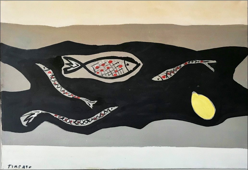 TURCATO GIULIO Mantova 1912 - Roma 1995 "Natura morta con pesci e limone" Olio su tela cm 100x70. Firmato sul fronte in basso a sinistra. Archiviazione su foto.