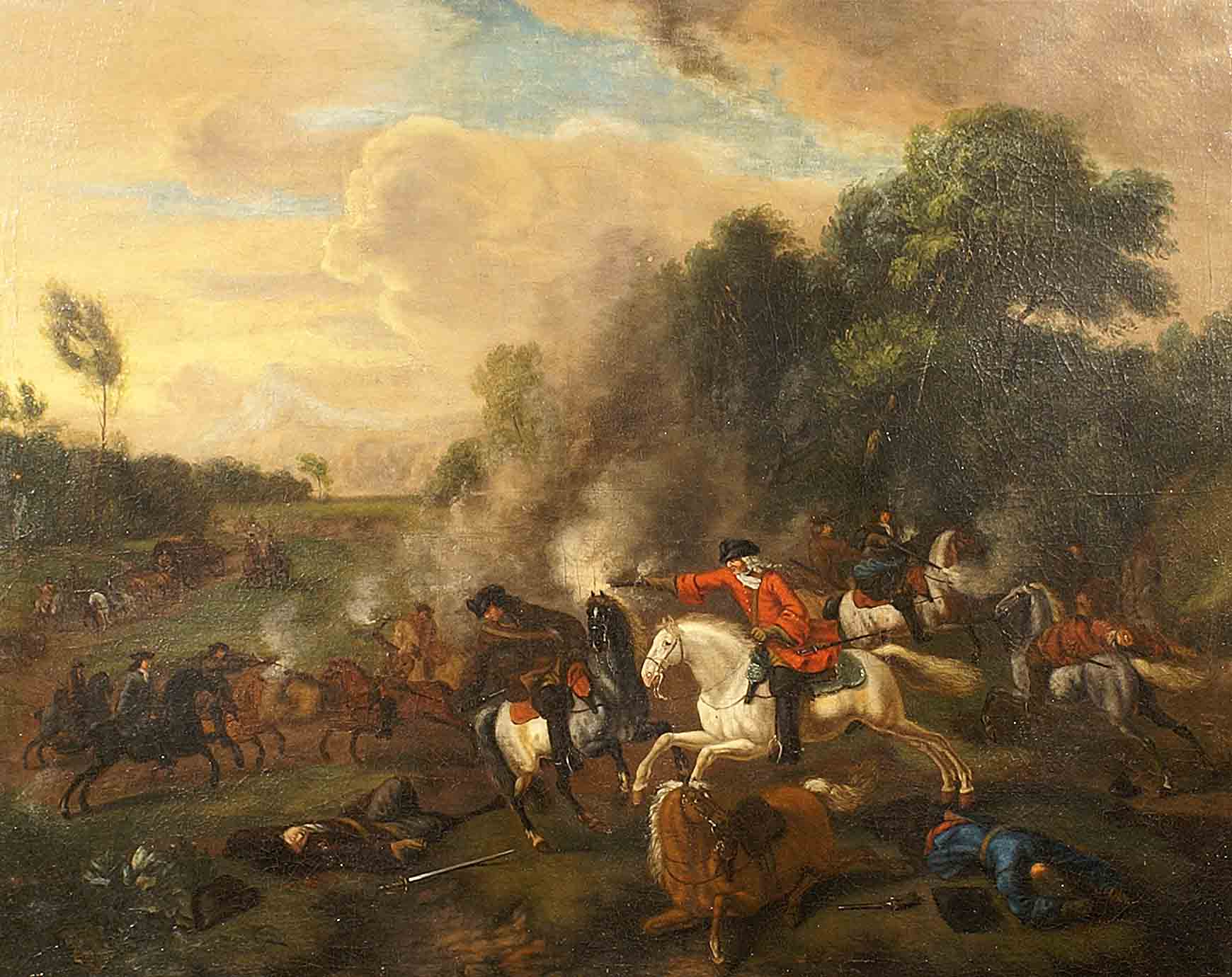 Scuola fiamminga del XVIII secolo, "Scena di battaglia", olio su tela, cm. 50x63, cornice coeva in legno dorato.