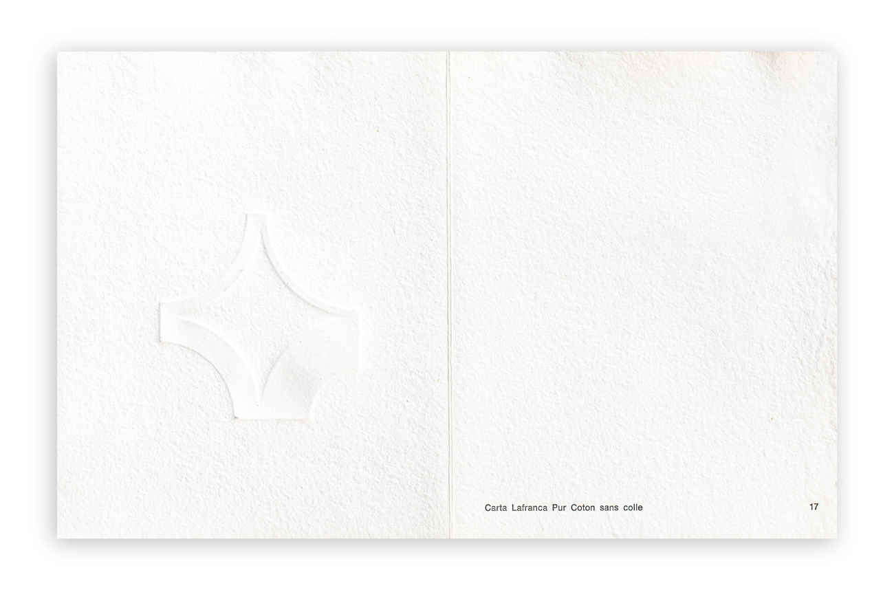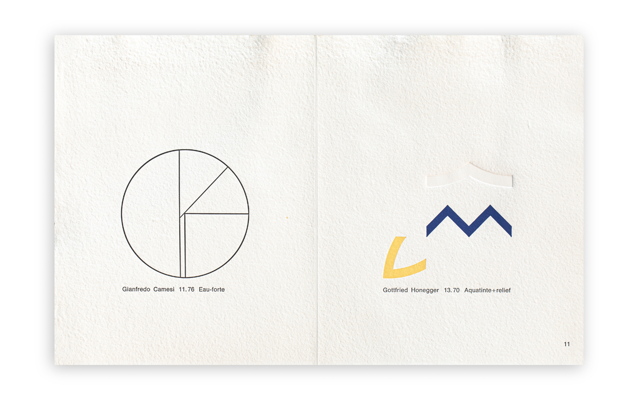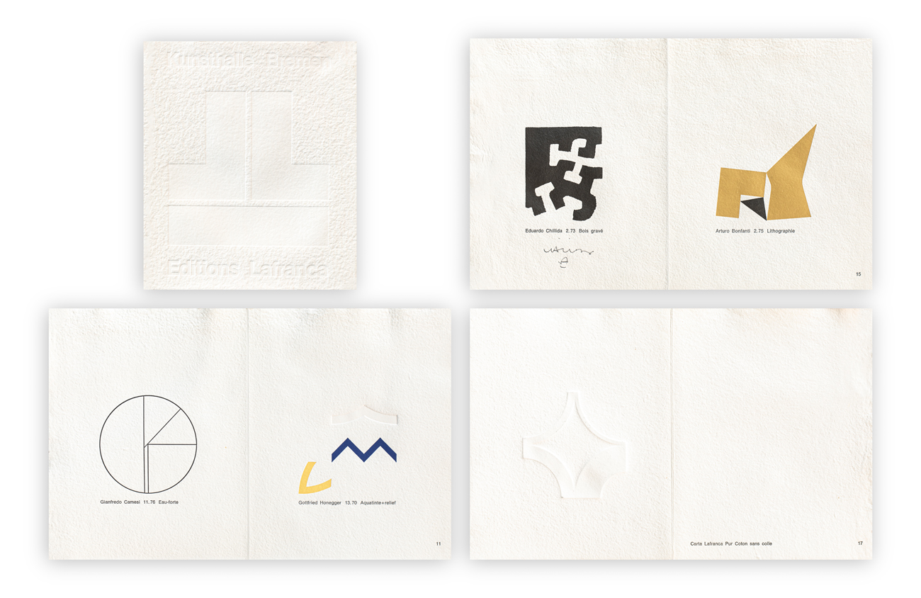 Edizione completa di 3 bifoli di cui 1 con acquaforte di Gianfredo Camesi e acquatinta e rilievo di Gottfried Honegger (Carta Lafranca), 1 con incisione di Eduardo Chillida e litografia di Arturo Bonfanti (Carta Lafranca Pur Lin), 1 con incisione di Marcel Wyss (Carta Lafranca Pur Coton sans colle), 2 cataloghi riccamente illustrati con fotografie del processo produttivo