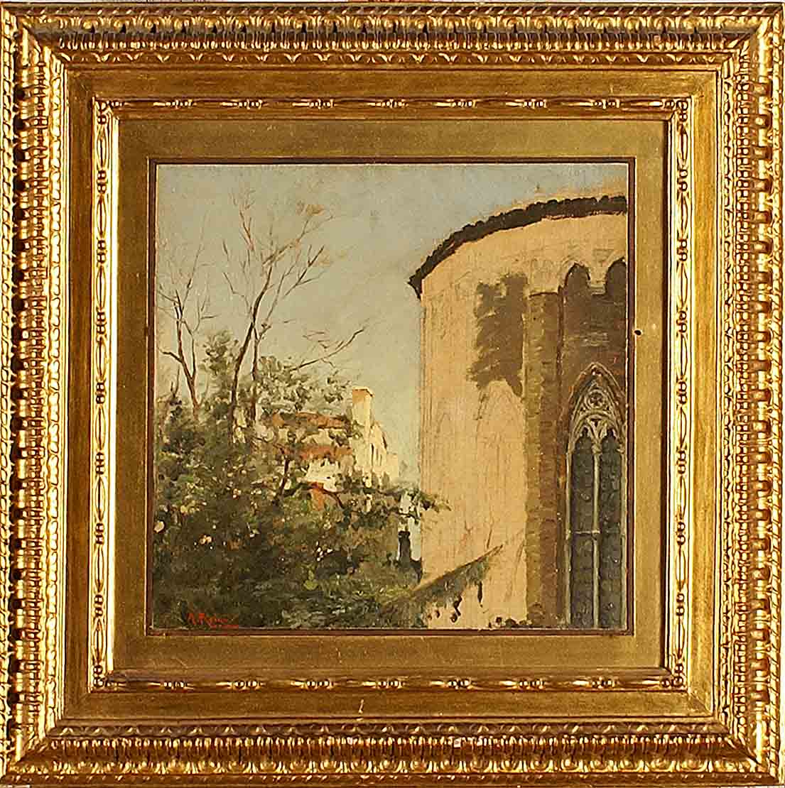 Antonio Maria Reyna (Spagna 1859 - 1937), "Studio di scorcio di chiesa", olio su tela, cm. 23x23, firmato in basso a sinistra.