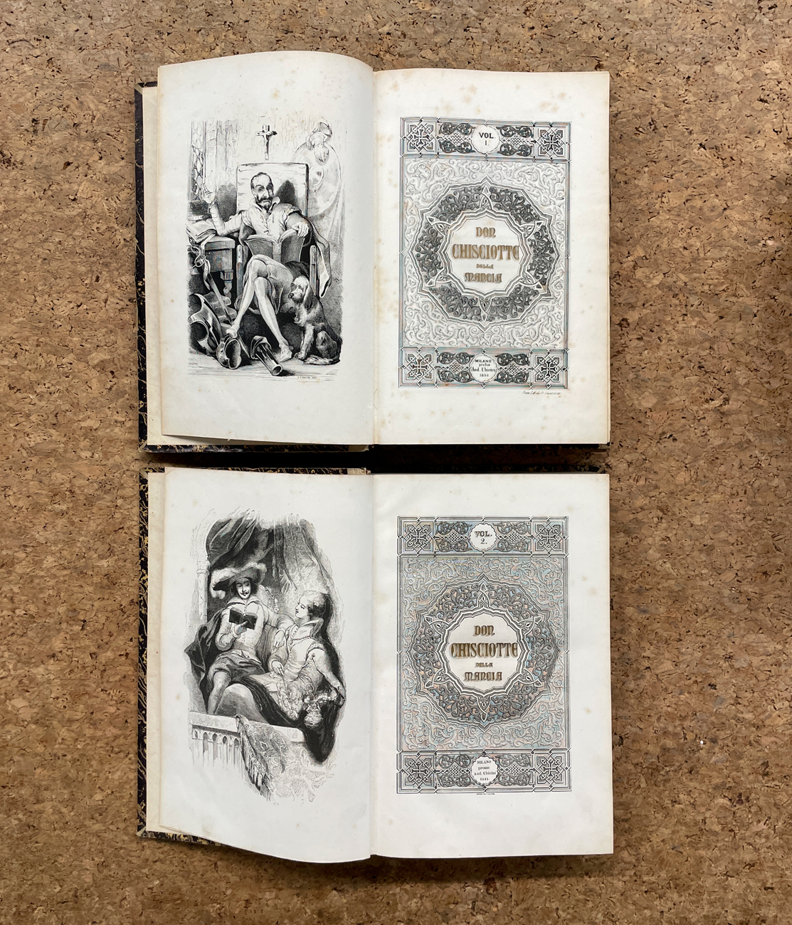 Due volumi recanti antiporta in litografia a ciascun volume, due frontespizi interamente illustrati e moltissime incisioni nel testo