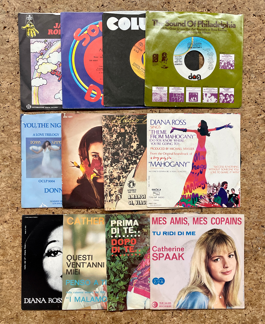 Lotto unico di 12 dischi 45 giri tra cui Jackie Robinson, Soulful disco, Columbia, The sound of Philadeplhia, Donna Summer, Lucio Battisti, Diana Ross (2), Catherine Spaak (3), Neil Seedaka
