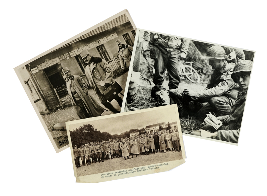 Raccolta di 40 fotografie della Prima Guerra Mondiale. Anni '10 del XX secolo. Raccolta di 40 fotografie in b/n e seppia relative alla Prima Guerra Mondiale. Molte presentano un foglietto dattiloscritto incollato, con descrizione in italiano e inglese dell'evento. Sul retro di alcune è apposto il timbro Lamp Reportage fotografico Roma. Dimensioni varie: da 145x 110 a 240x180 ca. SI AGGIUNGONO: Raccolta di 30 fotografie della Seconda Guerra Mondiale. Anni '40. (70)I DOCUMENTO: Storiche foto della Grande Guerra al di fuori dell'Italia. Ritraggono: L'arciduca Federico d'Austria con i suoi ufficiali e con le truppe; il convegno dei tre Re scandinavi a Malmö; l'Ufficio per la compilazione delle liste di perdite a Berlino; i gendarmi del Khedivé di Egitto; il cambio della guardia alla frontiera Franco-Belga; donne della Bucovina con i mariti in guerra; navi-ospedale austro-ungariche sul Danubio; mulini a vento distrutti in zona Mar Nero; lavori di scavo manuale per la metropolitana di Berlino, nonostante la guerra; una sotnja di cosacchi; truppe neozelandesi; aviatori austriaci accanto a un biplano; artiglieria australiana in difesa dell'Egitto; la preparazione della carne in conserva per l'esercito tedesco; prigionieri di guerra (russi, tedeschi, serbi, belgi e inglesi; le devastazioni russe nella Prussia orientale; gli effetti del bombardamento tedesco su Scarborough (UK); un aratro a motore nell'ex piazza d'armi a Berlino; ecc. II DOCUMENTO: Le foto ritraggono: l'esplosione nucleare ad Okinawa in Giappone nel 1945; spedizione di coperte; vedute aeree; un treno con bottino tedesco fermato a Brennero; protagonisti nazisti e alleati; soldati; ambasciata americana a Tokio; sepolture; prigionieri; bombardamenti; navi ecc.