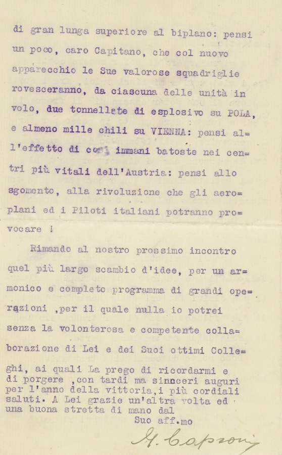 Caproni Gianni, Lettera dattiloscritta con firma autografa, inviata al capitano [Luigi] Falchi. Datata 22 gennaio 1917. Dattiloscritto a inchiostro blu con firma autografa. Un bifolio intestato Ing. Gianni Caproni, via S. Gregorio, 28, Milano, 4 pagg. scritte. Busta conservata, senza francobollo. Dimensioni 125x200 mm. (1)L'ingegner Caproni, storico pioniere dell'aviazione italiana, ringrazia il capitano [e medico] Luigi Falchi comandante di Gruppo Aeroplani Caproni di Aviano, per l'impresa da lui compiuta con quel coraggioso bombardamento notturno durante la Prima Guerra Mondiale. Insieme a Falchi, Caproni ricorda il tenente [Germano] Ruggerone ed il brigadiere [Demetrio] Artuso. I tre aviatori parteciparono al primo bombardamento aereo notturno sopra la zona del monte Hermada e furono tutti insigniti di medaglia al valor militare. Caproni utilizza l'impresa per fare adottare dalla Regia Aeronautica il suo nuovo triplano 600 al posto dei biplani. [...] A Roma, in terra d'infedeli, (mi perdoni e conservi tutta per Lei l'espressione forse troppo sincera,) non sarei giunto a spuntare le tante obbiezioni che erano state sollevate [...] per l'impiego notturno dei grandi apparecchi di bombardamento [...]. Riferendosi poi ai nuovi triplani: [...] col nuovo apparecchio le Sue valorose squadriglie rovesceranno, da ciascuna delle unità in volo, due tonnellate di esplosivo su POLA e almeno mille chili su VIENNA [...].