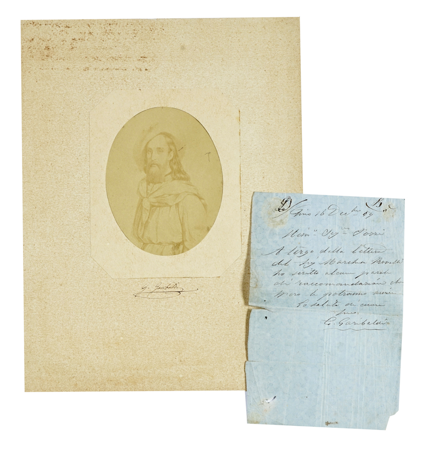 Garibaldi Giuseppe, Lettera autografa firmata inviata al sig. Pozzi. Datata Fino (Mornasco) 16 dicembre 1859. Manoscritto a inchiostro nero, su carta azzurra. Una pagina scritta. Dimensioni 130x205 mm. SI AGGIUNGE: Rovelli Pietro. Lettera autografa firmata, inviata a Giuseppe Garibaldi (con annotazione autografa di Garibaldi). Datata Como 16 dicembre 1859. SI AGGIUNGE: Ritratto fotografico di Garibaldi (albumina ovale da litografia del 1849). Passe-partout timbrato Fotografia Bertinazzi Bologna, con firma - G. Garibaldi - (non autografa). Dimensioni ovale 100x125 mm, passe-partout 240x320 mm. (3)I E II DOCUMENTO: Le due lettere, originariamente unite con ceralacca (oggi staccata) sono state inviate al Sig. Pozzi. Nella lettera di Garibaldi si legge infatti: - A tergo della lettera del sig. Marchese Rovelli ho scritto alcune parole di raccomandazione che le potranno servire. La saluto di cuore. Suo G. Garibaldi. La lettera di Rovelli è una raccomandazione a Garibaldi in favore del sig. Matteo Pozzi, di Como, che si era introdotto valorosamente nell'accampamento austriaco del generale Urban alla Camerlata. Scrive Rovelli: [...] col mezzo suo potei poscia immediatamente notiziare lei, Illustre Generale, a Varese, dell'attacco che doveva seguire alle ore tre del susseguente mattino [...] Aff.mo Rovelli Pietro ex capitano. Al verso, l'annotazione autografa (firmata) di Garibaldi: Fino, 16 dicembre 1859 Io raccomando in conseguenza de' servigi prestati [...] Nazionale il sig. Matteo Pozzi. G. Garibaldi. Il luogo (Fino Mornasco), la data, 16 dicembre 1859, e il nome di Pietro Rovelli sono legati alla curiosissima storia del matrimonio lampo di Garibaldi, grande tombeur de femmes. Nel gennaio del 1860 Garibaldi, che ha già 52 anni, sposa a Fino Mornasco la diciottenne Giuseppina Raimondi. Non sa che l'avvenente fanciulla ha già alcuni amanti, tra i quali l'ufficiale Luigi Caroli e lo stesso Pietro Rovelli, che, alla fine della cerimonia nuziale consegna al generale una lettera anonima in cui svela la tresca della neo-sposina con l'ufficiale Luigi Caroli (omettendo la propria). Giuseppina Rovelli viene ripudiata seduta stante e Caroli finisce in disgrazia. Pochi mesi dopo avrà inizio la spedizione dei Mille.